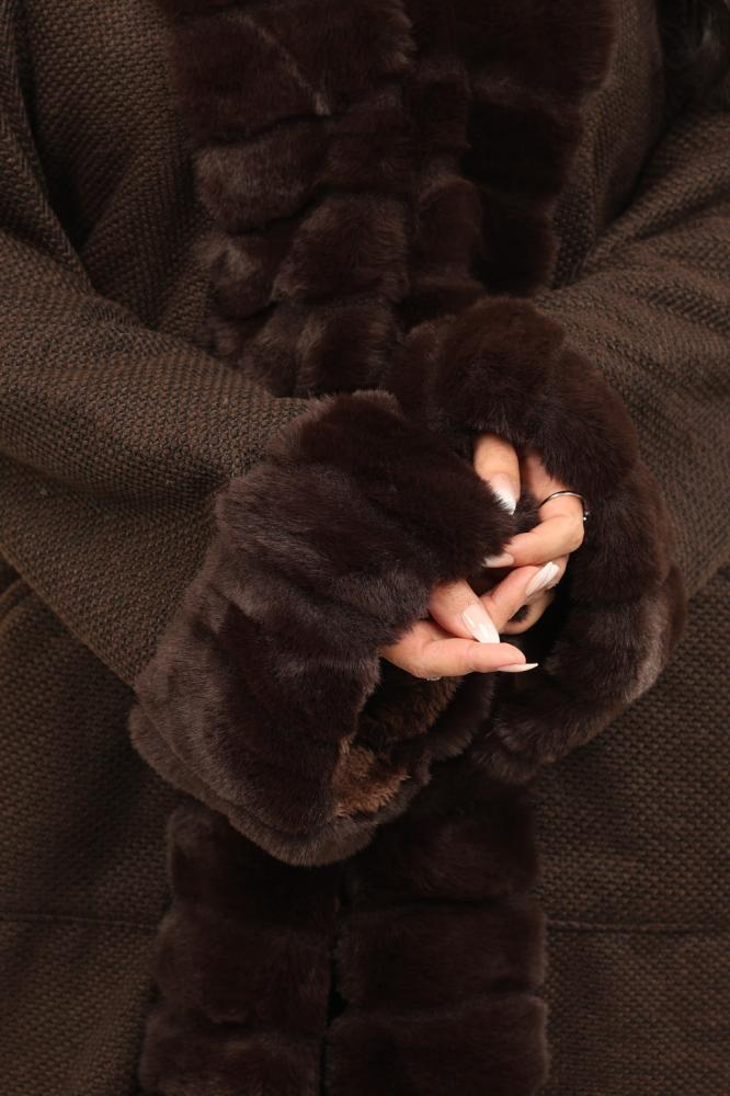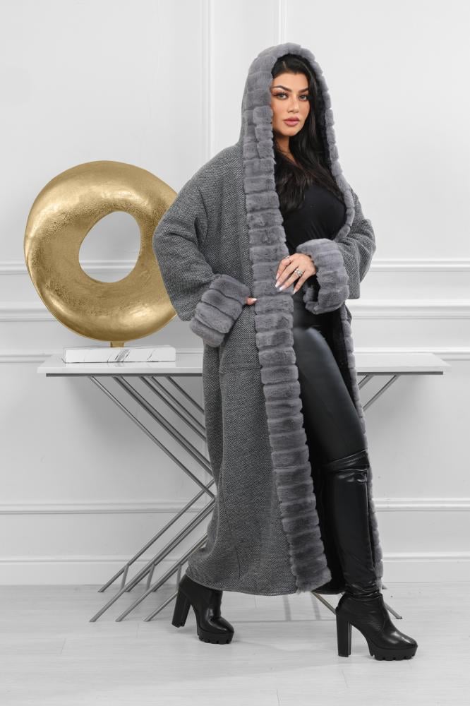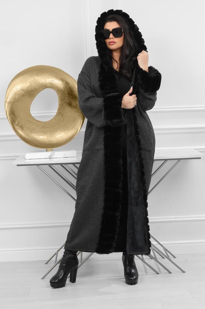 بشت شتوي بتصميم مفتوح سادة، مزود بقماش فرو حول الياقة ومنطقة الصدر، وفي نهاية الأكمام الطويلة الواسعة للمعطف، مع بطانة داخلية لتوفير الدفء .