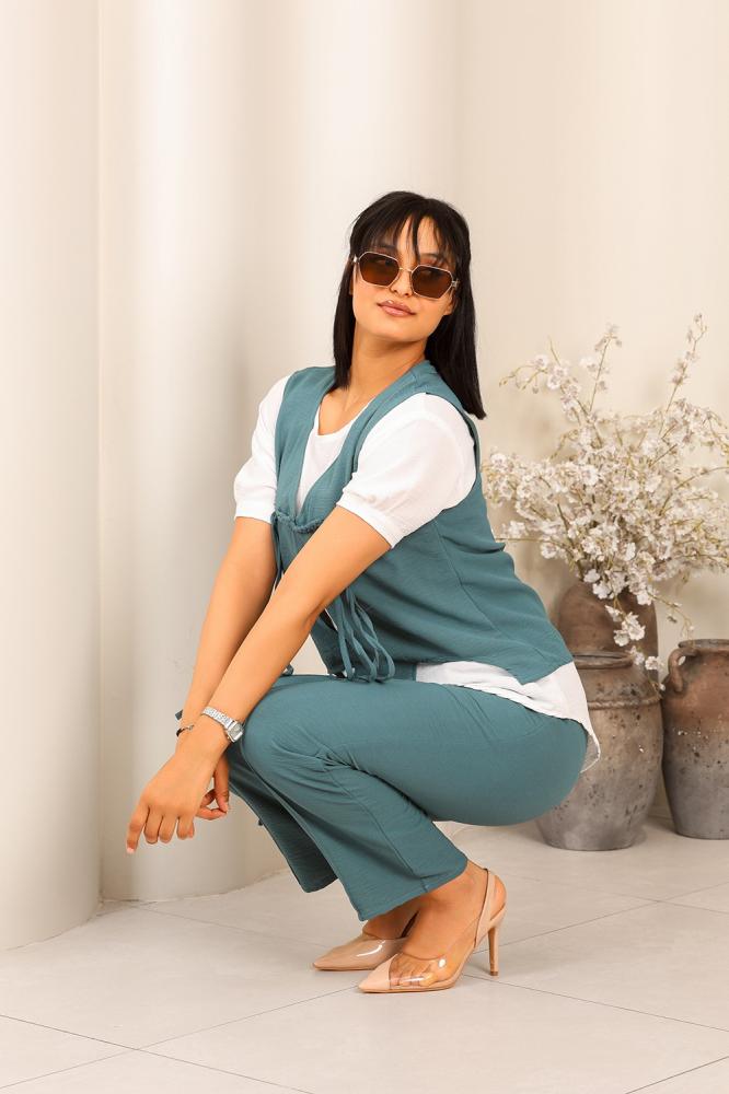 - المنتج الرئيسي هو زي نسائي كامل ومتناسق يتكون من ثلاث قطع: جيليه (صدرية) بدون أكمام بنطلون مطابق بنفس اللون، وتوب داخلي أساسي باللون الأبيض.