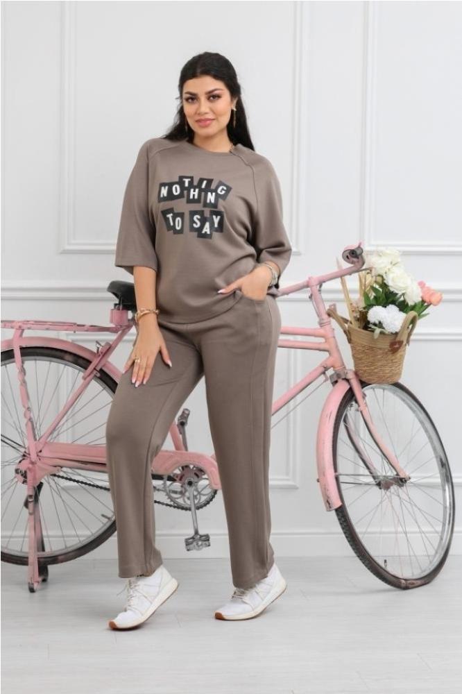 التفاصيل الجمالية: الخط المُتدرج للعبارة المكتوبة (بخط عريض ومُتقطع) يُضفي طابعًا مرحًا وشخصيةً فريدة، بينما القصة الواسعة للبنطلون والكم الطويل تُعزز صورة الموضة الرياضية العصرية.