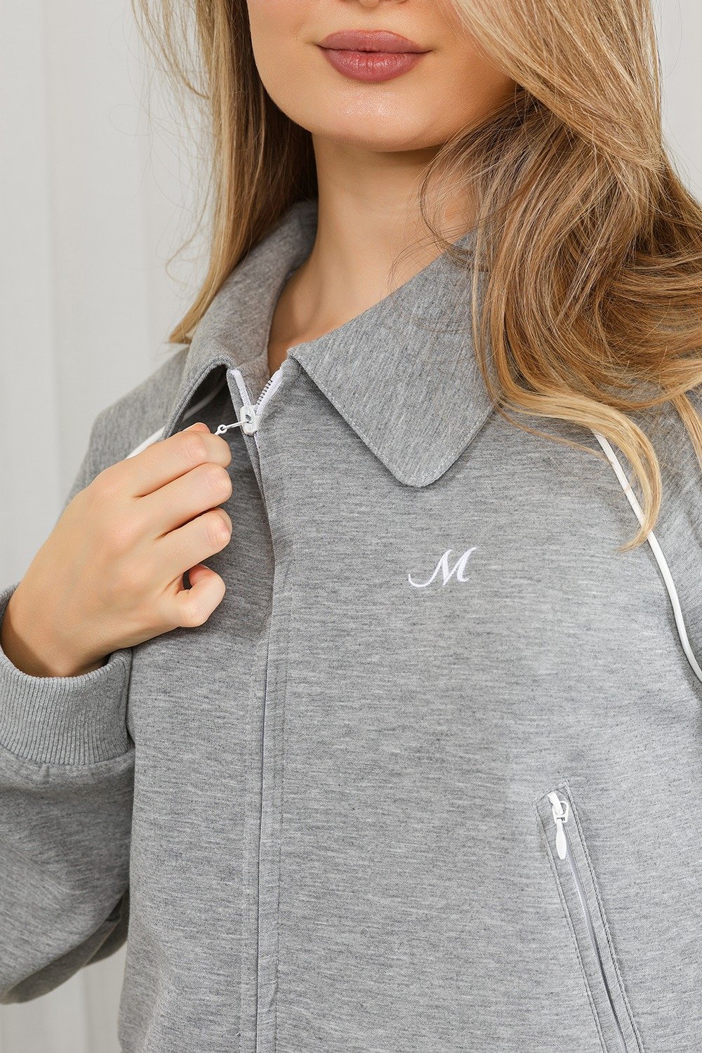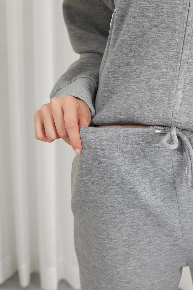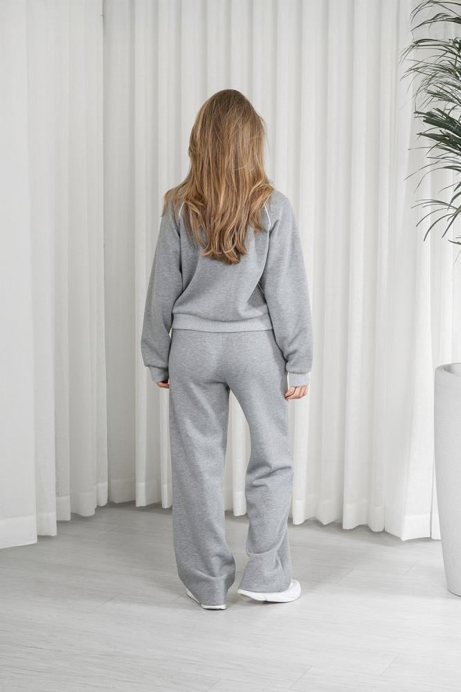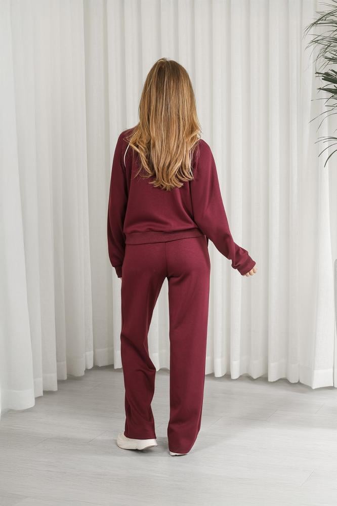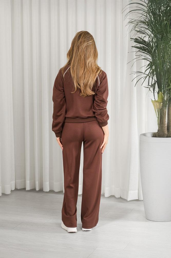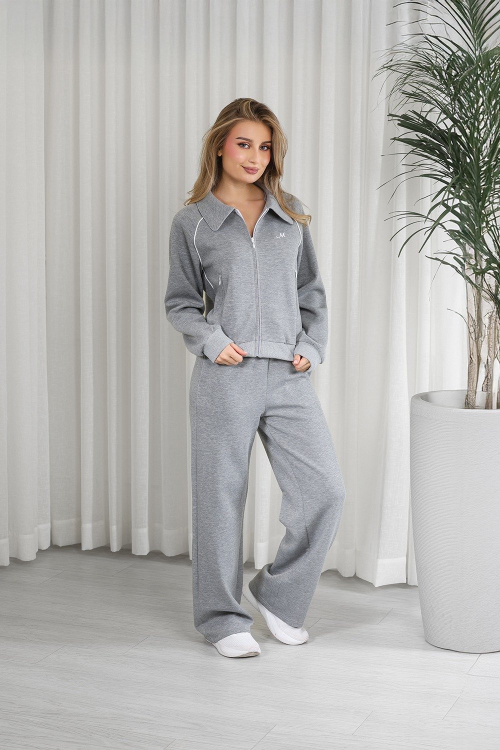 طقم رياضي–كاجوال مكوَّن من جاكيت بسحّاب كامل وبنطلون بقصة مستقيمة واسعة.