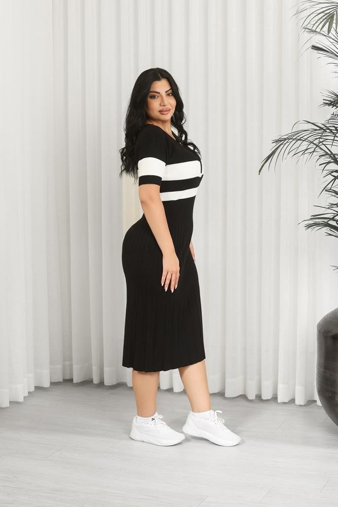 فستان ميدي قصير الأكمام مخطط، بقصة ضيقة تبرز القوام مع ياقة بسحاب قصير.