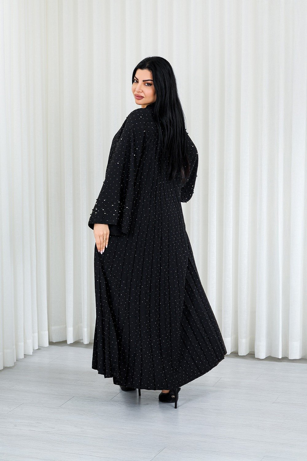 جلابية قماش بطول يصل للكاحل بياقة قصيرة بنهايات أكمام واسعة مزينة باللؤلؤ البراق