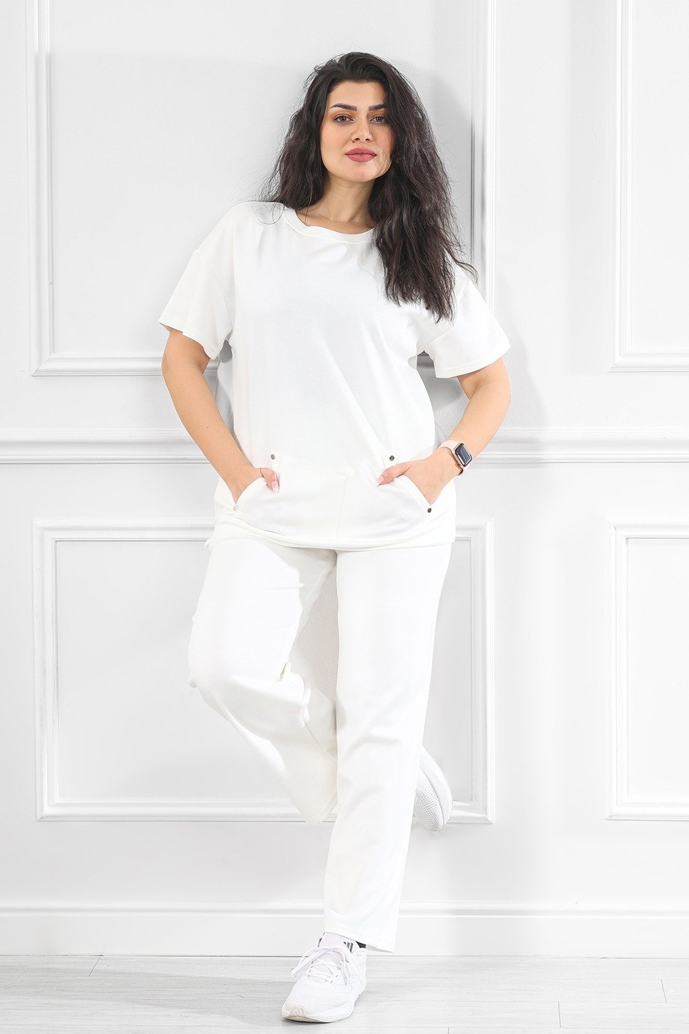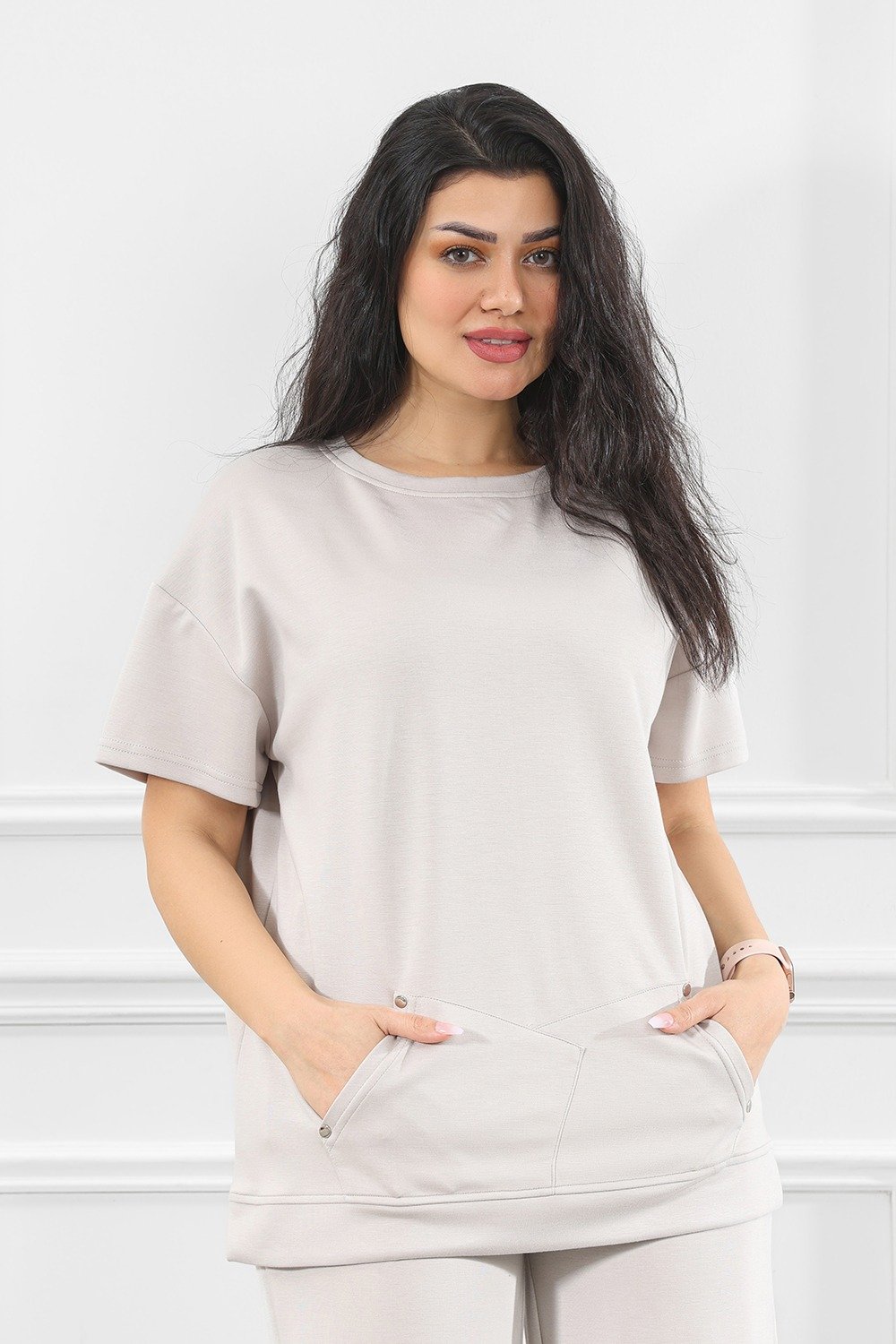 ترنج نسائي كاجوال طبي سادة أكمام متوسطة الطول و تيشرت طويل مزود بجيب جانبية