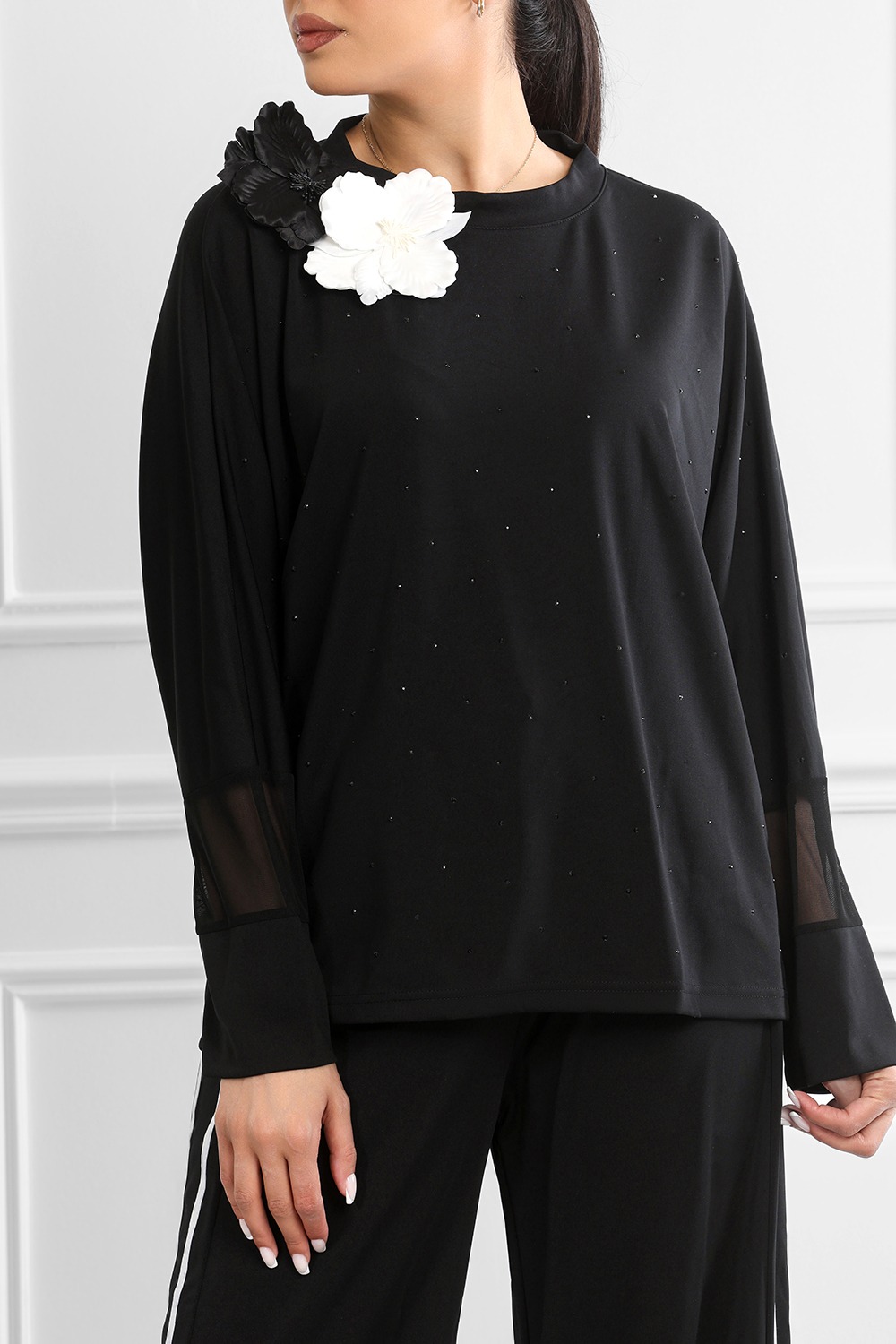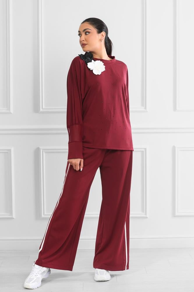 طقم مكوّن من توب بأكمام طويلة واسع، بنطال بقصّة أرجل واسعة، وحذاء رياضي أبيض.