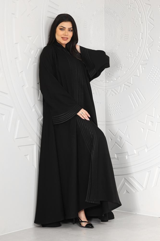 عباية قماش كريب الفاخر خطوط زري أسود في الأمام والأكمام دبل كلوش