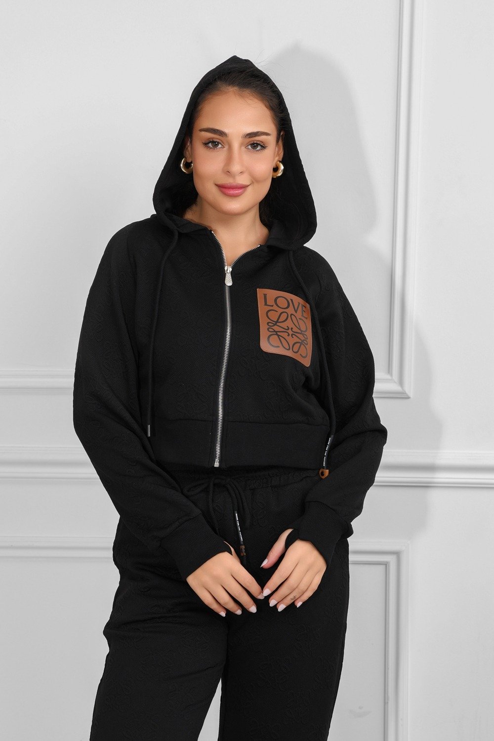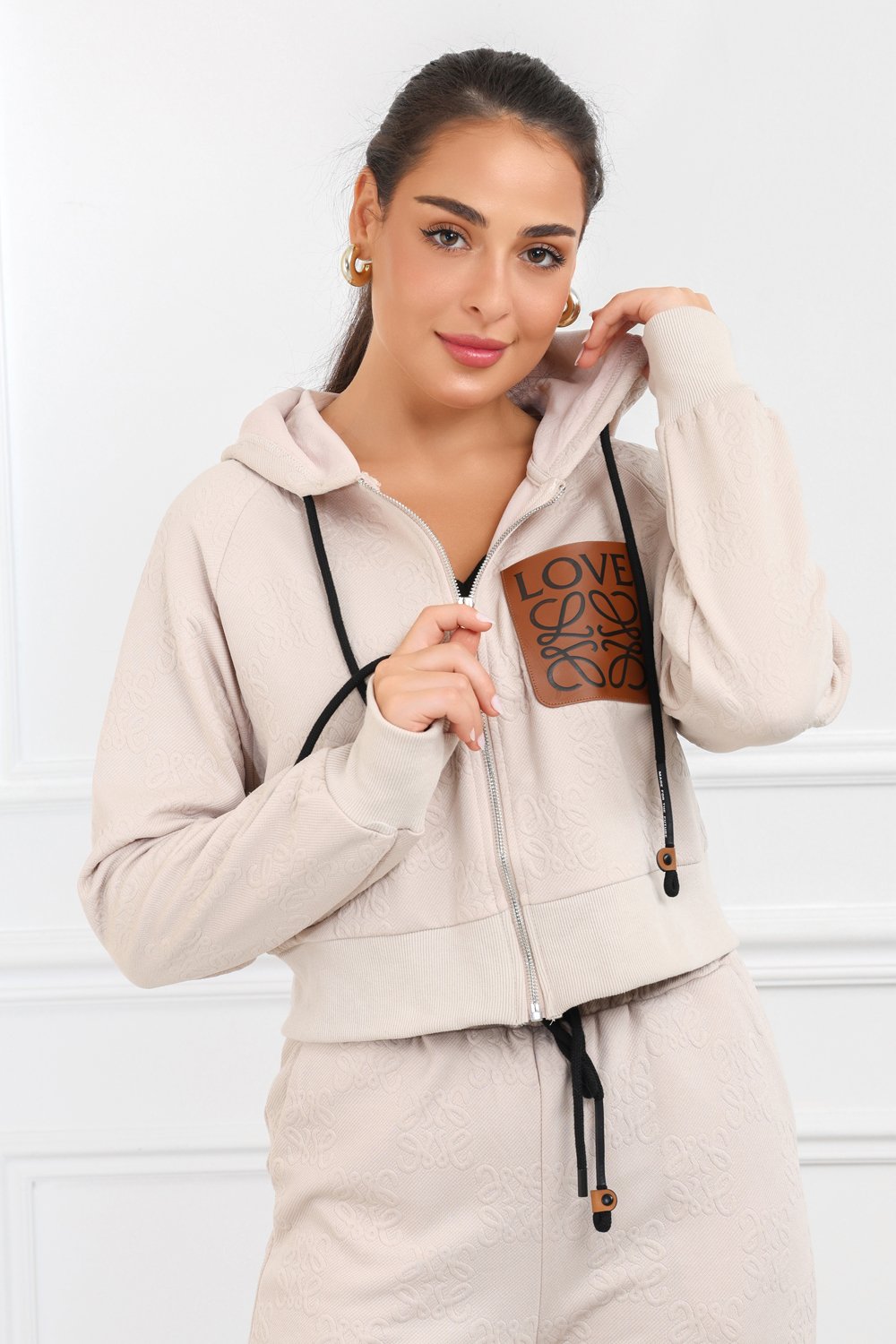 طقم نسائي، بتصميم كاجوال ومظهر رياضي، مُكون من قطعتين، سويت شيرت قصير بأكمام طويلة وقبعة قابلة للتعديل برباط، مزود بلوجو بجانب الصدر، مع بنطال واسع بقصة مستقيمة من خامة مريحة فضفاضة.