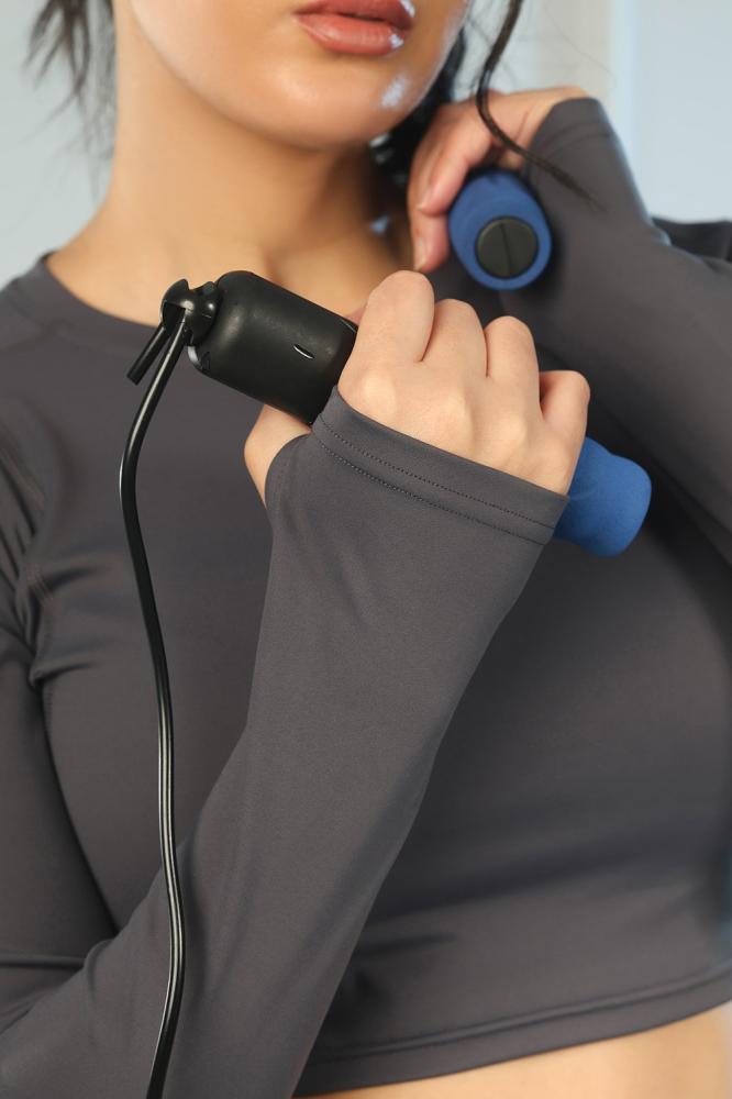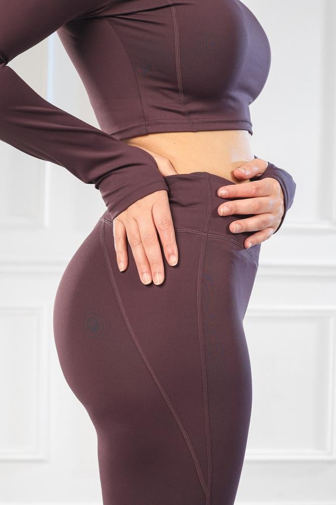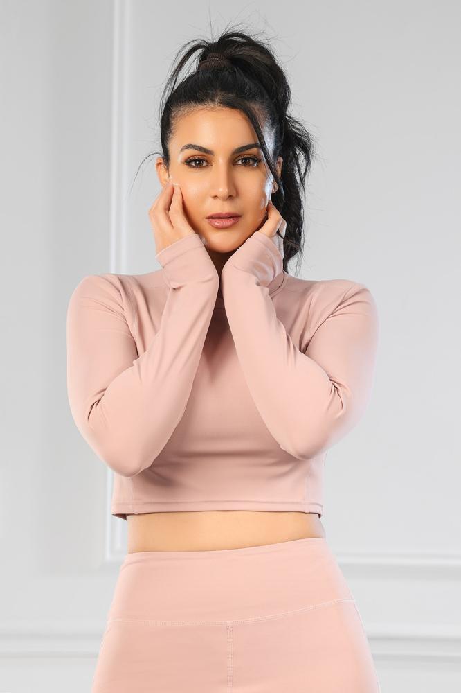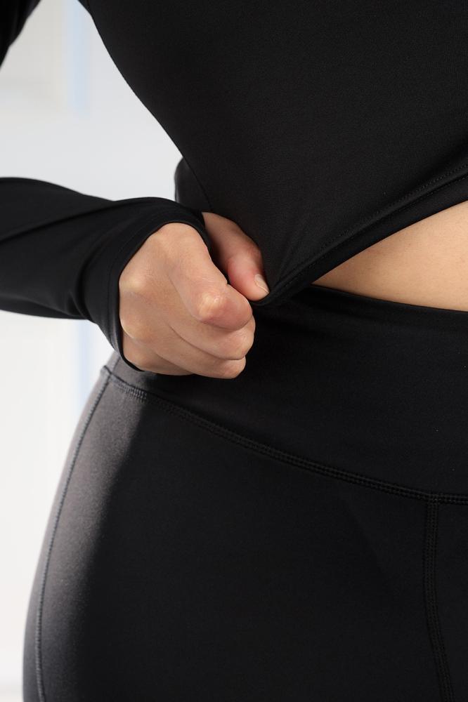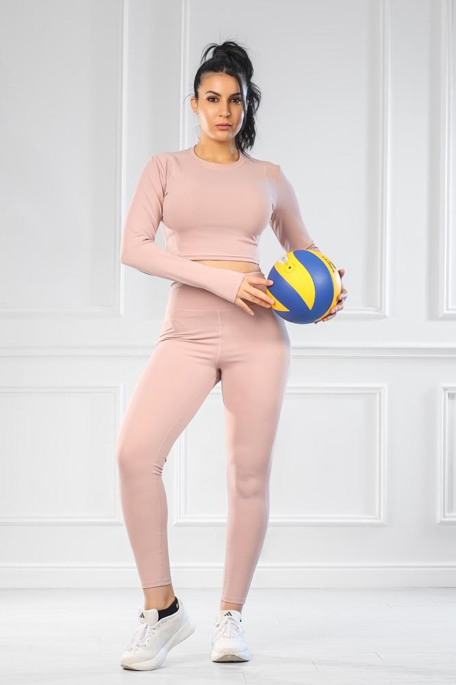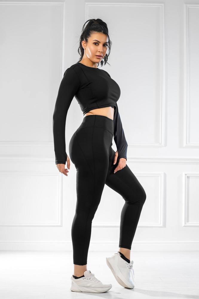 البلوزة قصيرة لتمنح حرية في منطقة الخصر، والأكمام طويلة لتغطية الذراعين. الليجنز كامل الطول.