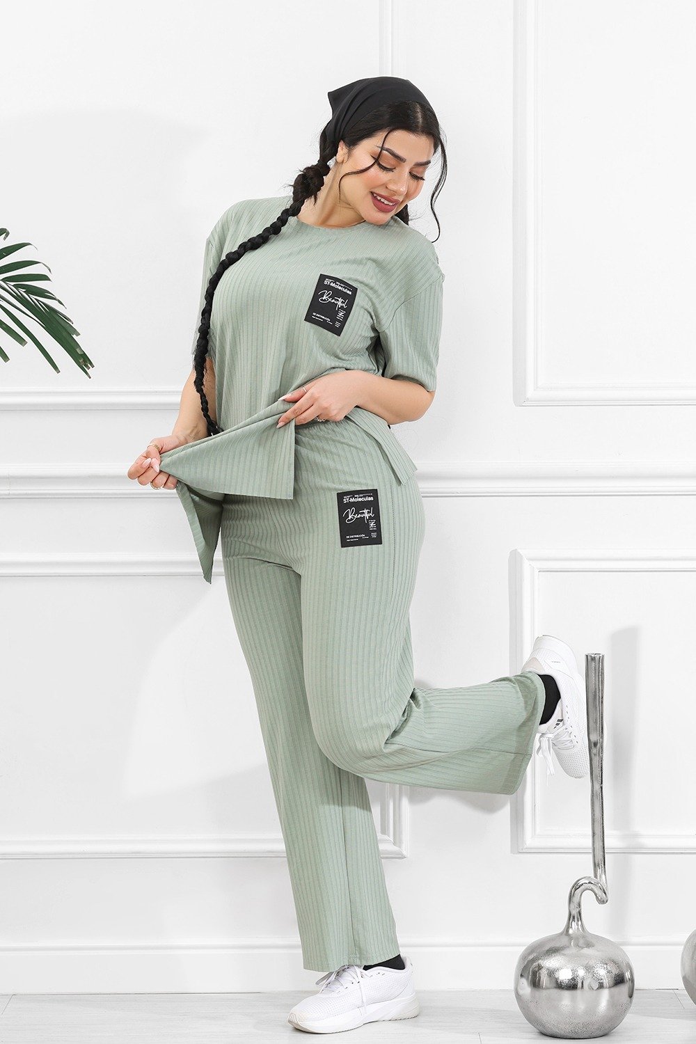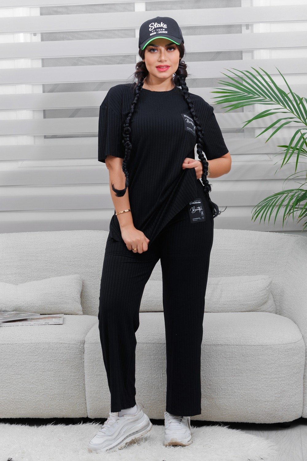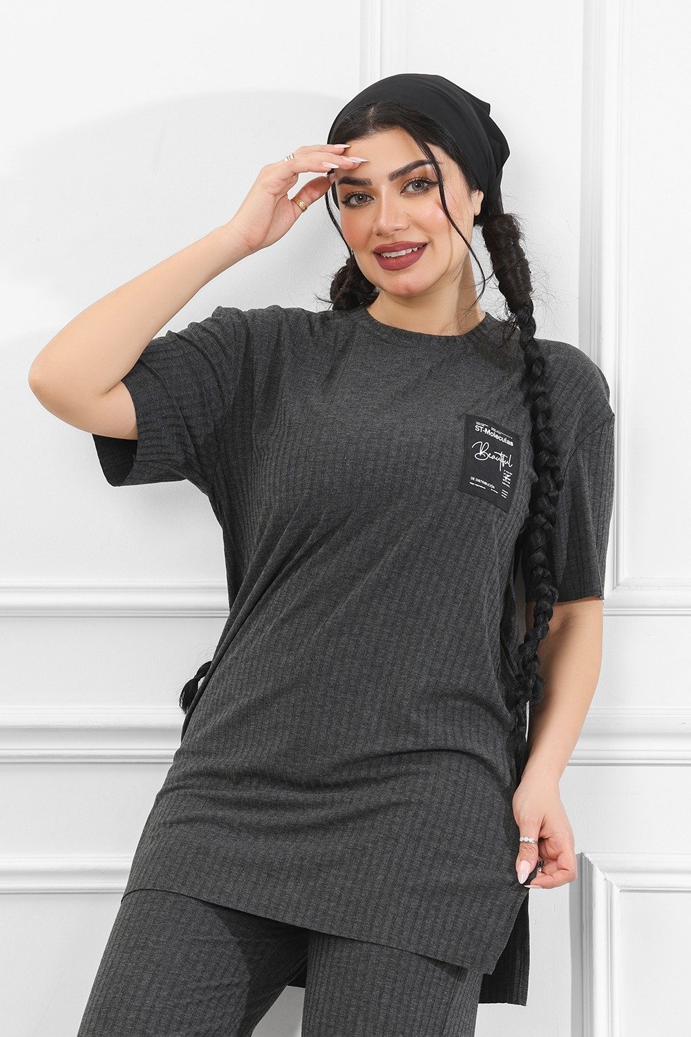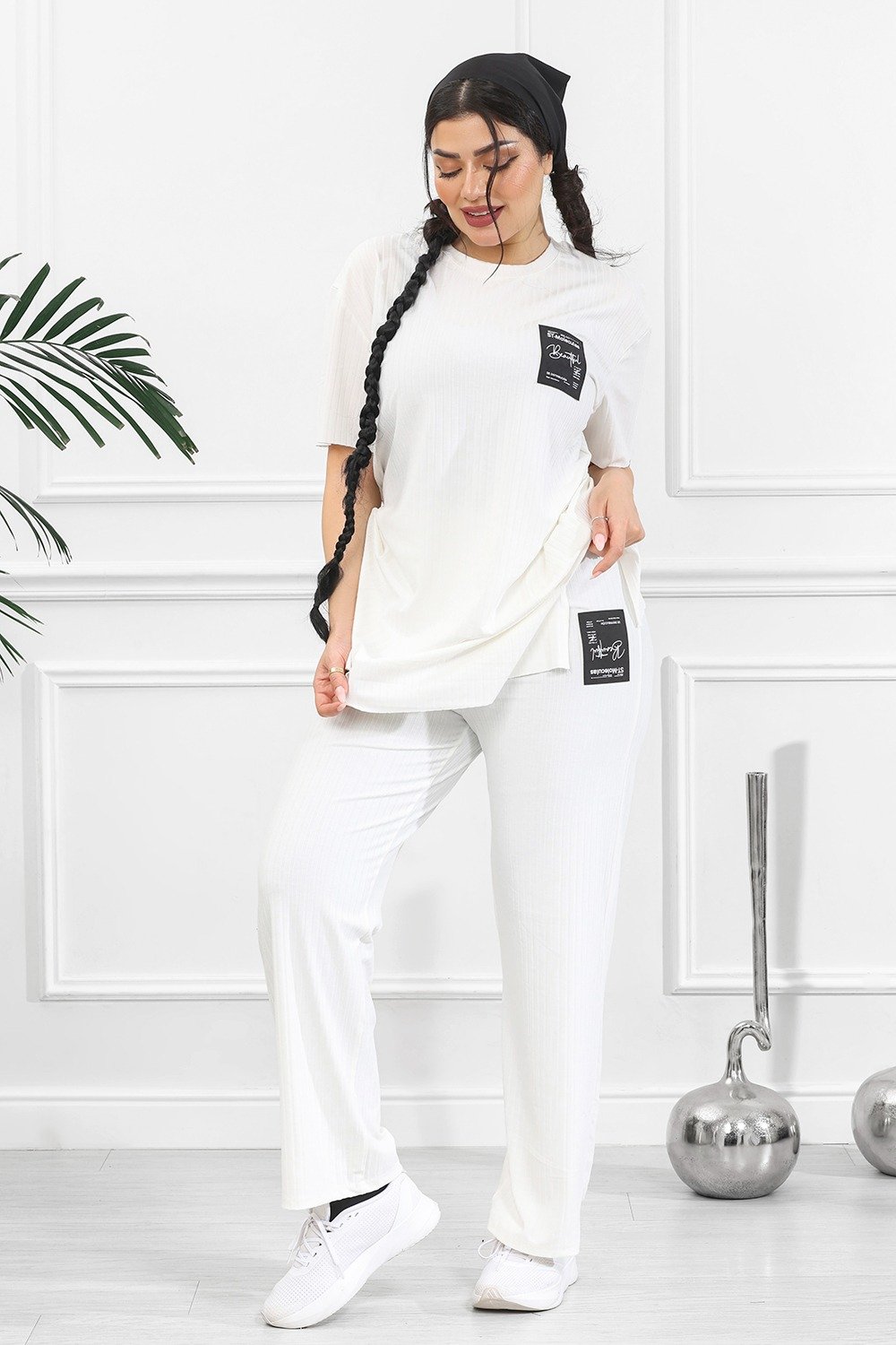 التصميم المُتماثل للتيشيرت والبنطلون يعكس تناسقًا بصريًّا مع لمسةٍ من القوام المُضلّع الذي يضفي عمقًا وجاذبيةً دون إفراط.