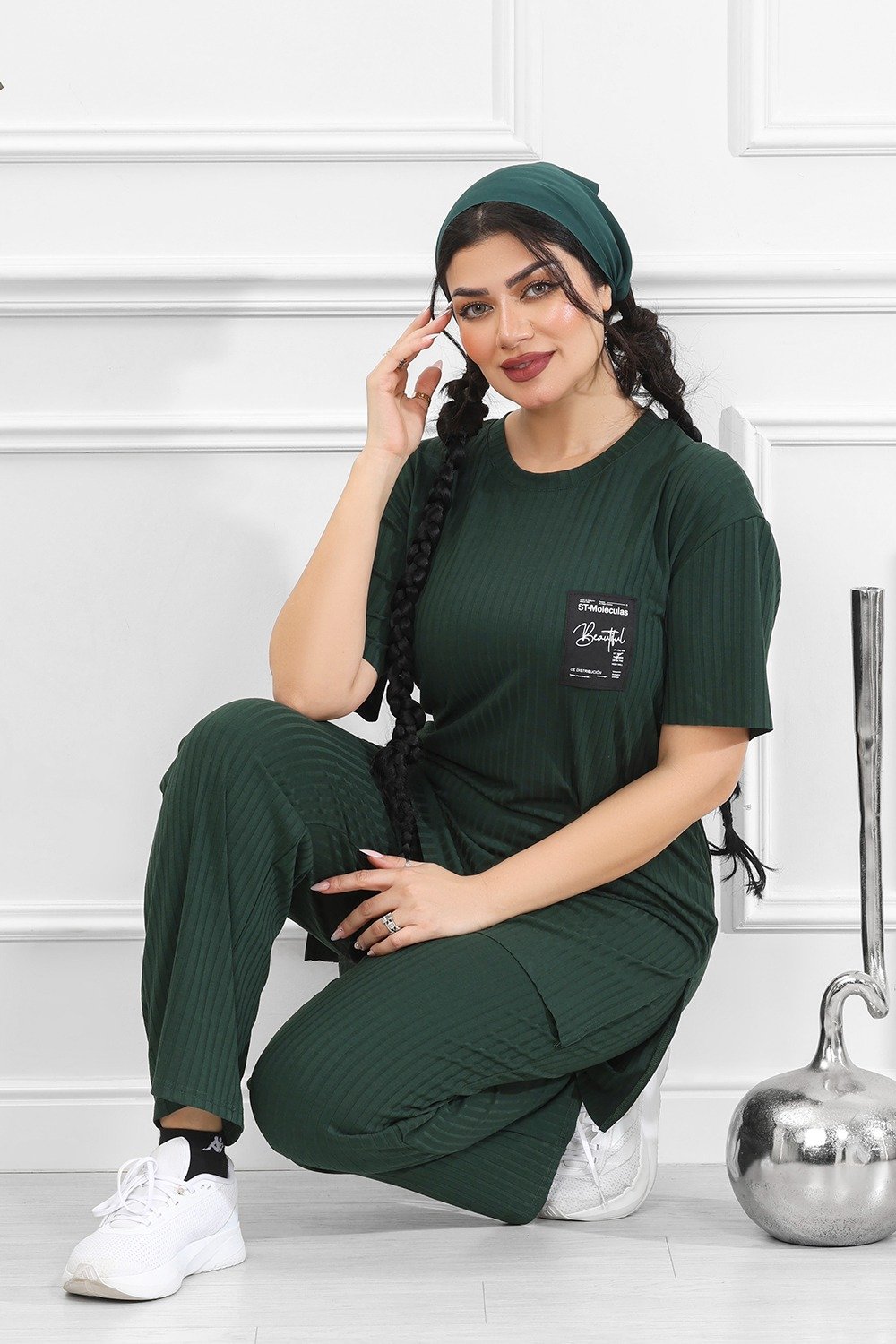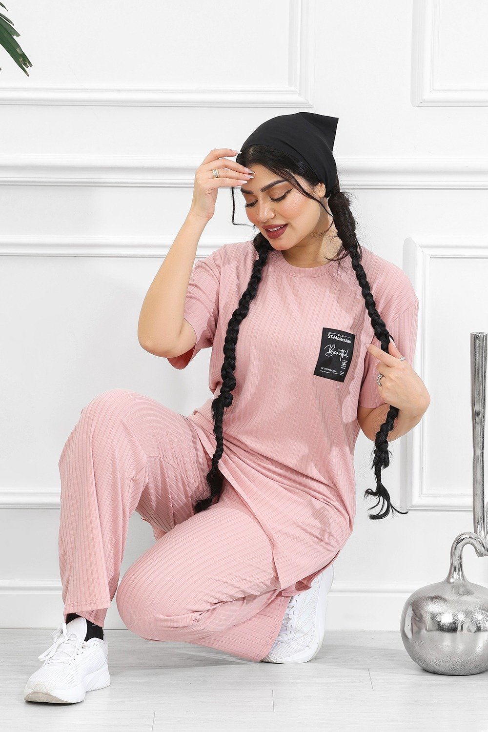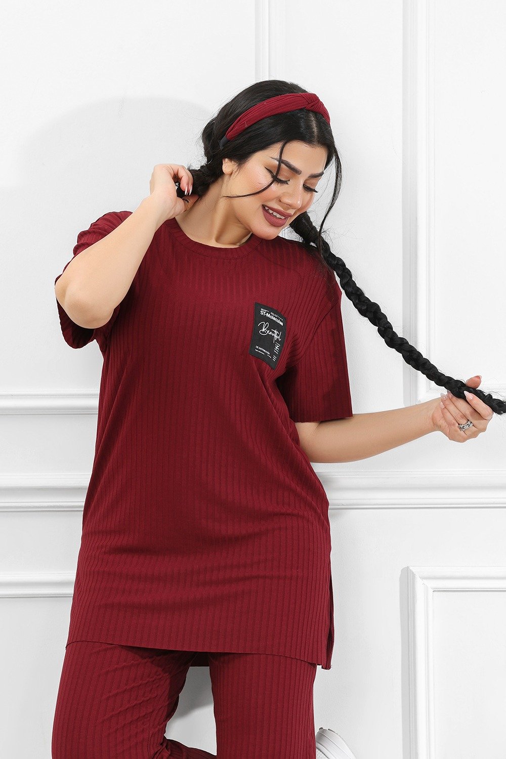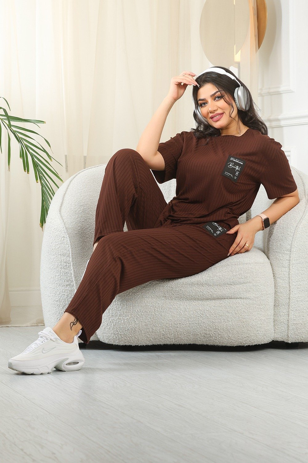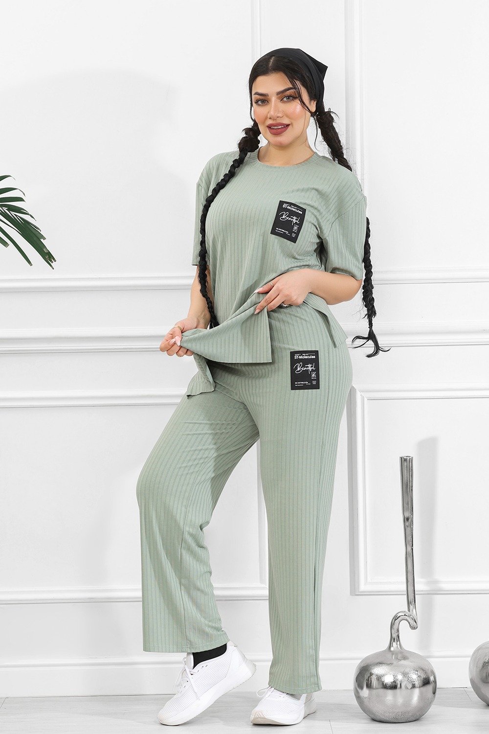 التصميم المُتماثل للتيشيرت والبنطلون يعكس تناسقًا بصريًّا مع لمسةٍ من القوام المُضلّع الذي يضفي عمقًا وجاذبيةً دون إفراط.