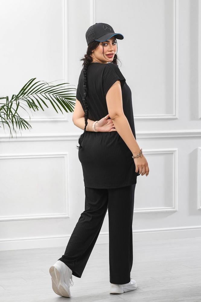 تصميم الأكمام الواسعة والسروال الفضفاض يُلائم جميع أشكال الجسم، بينما الأربطة المطاطية الخفية في الخصر قد تُضيف راحة إضافية.