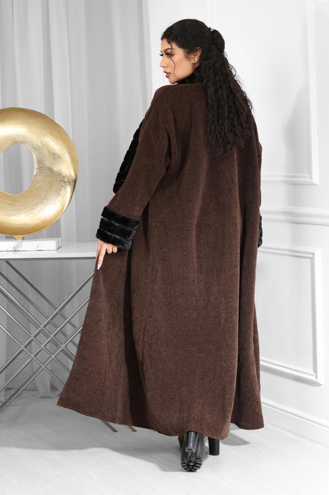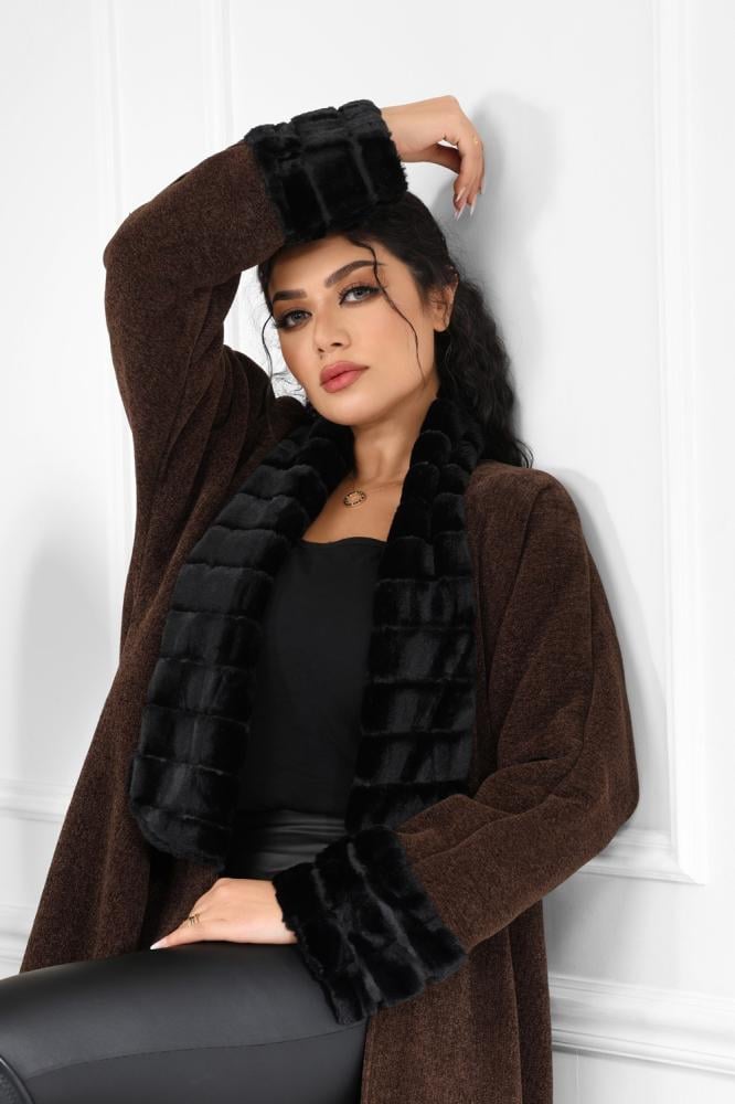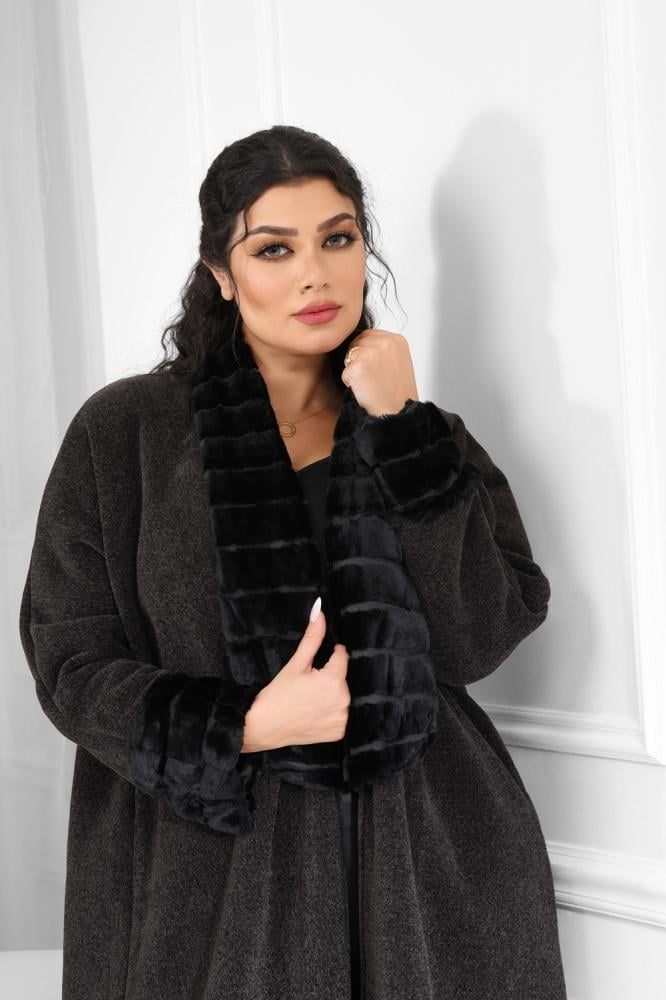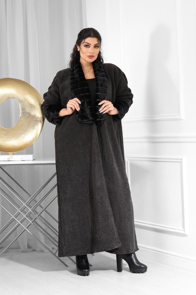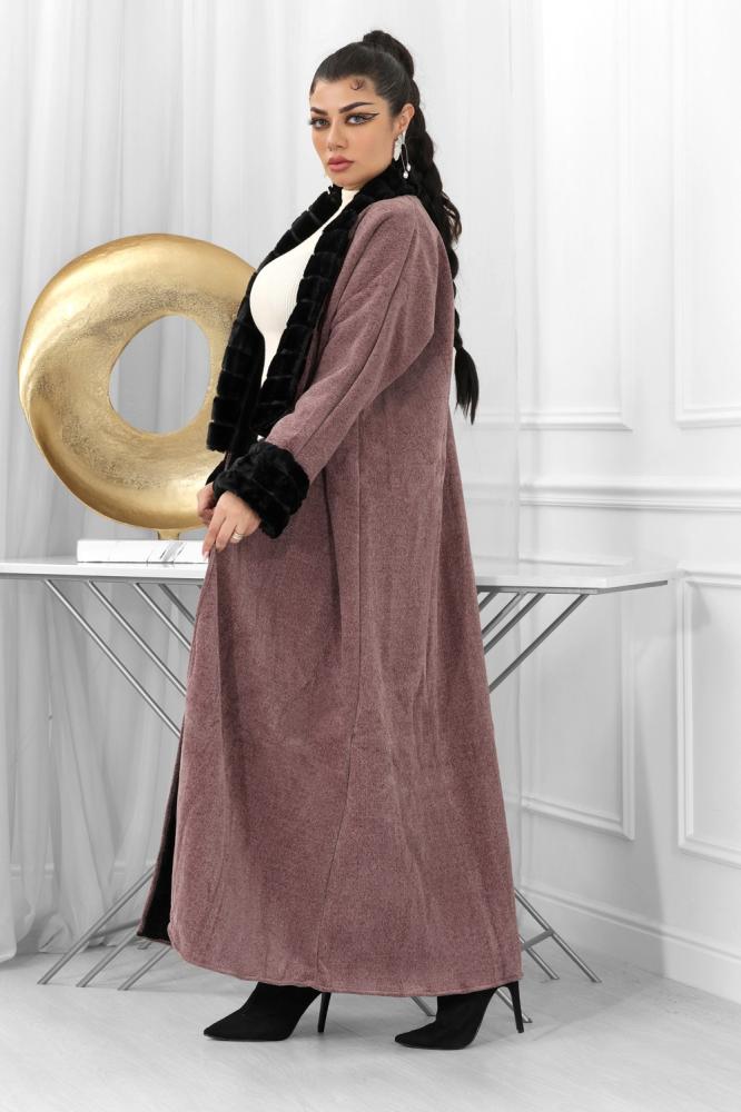 بشت طويل ماسكي بتصميم مفتوح سادة، مزود بقماش فرو حول الياقة ومنطقة الصدر، وفي نهاية الأكمام الطويلة الواسعة للمعطف، مع بطانة داخلية لتوفير الدفء، نوفره بخطاف معدني صغير لإغلاق أنيق.