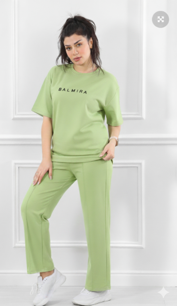 - تيشيرت مطبوع عليه كلمة "BALMIRA" على الصدر، يُضفي هويةً مميزةً للتصميم بأكمام قصيرة وقطع فضفاض، وسروال واسع الأرجل مع خصر مرتفع.