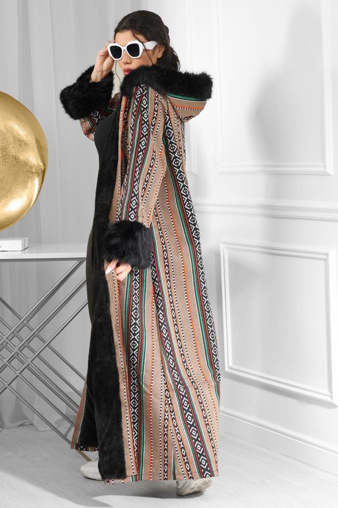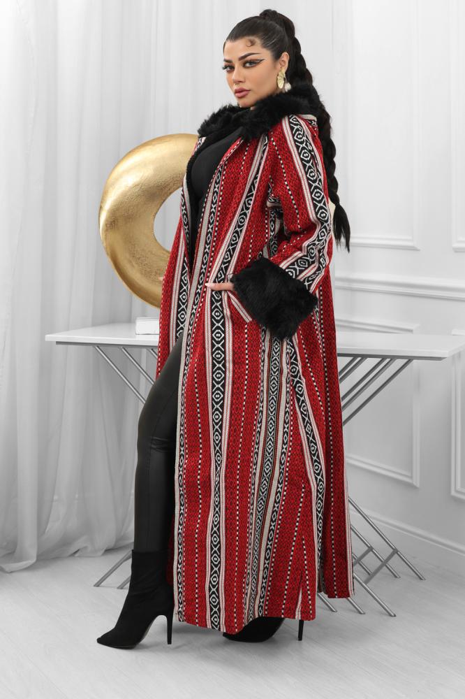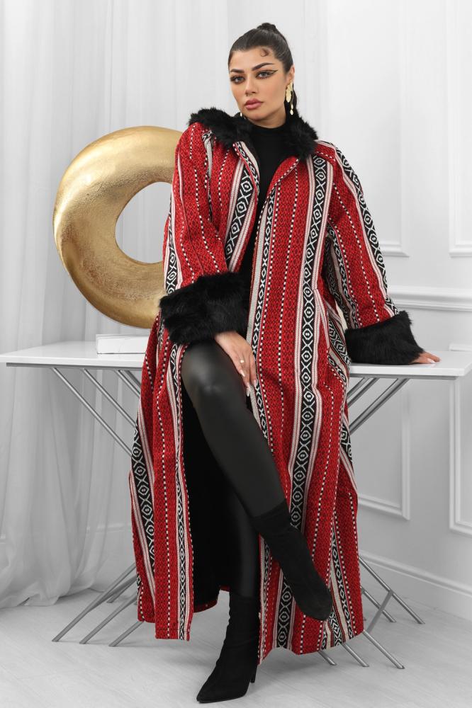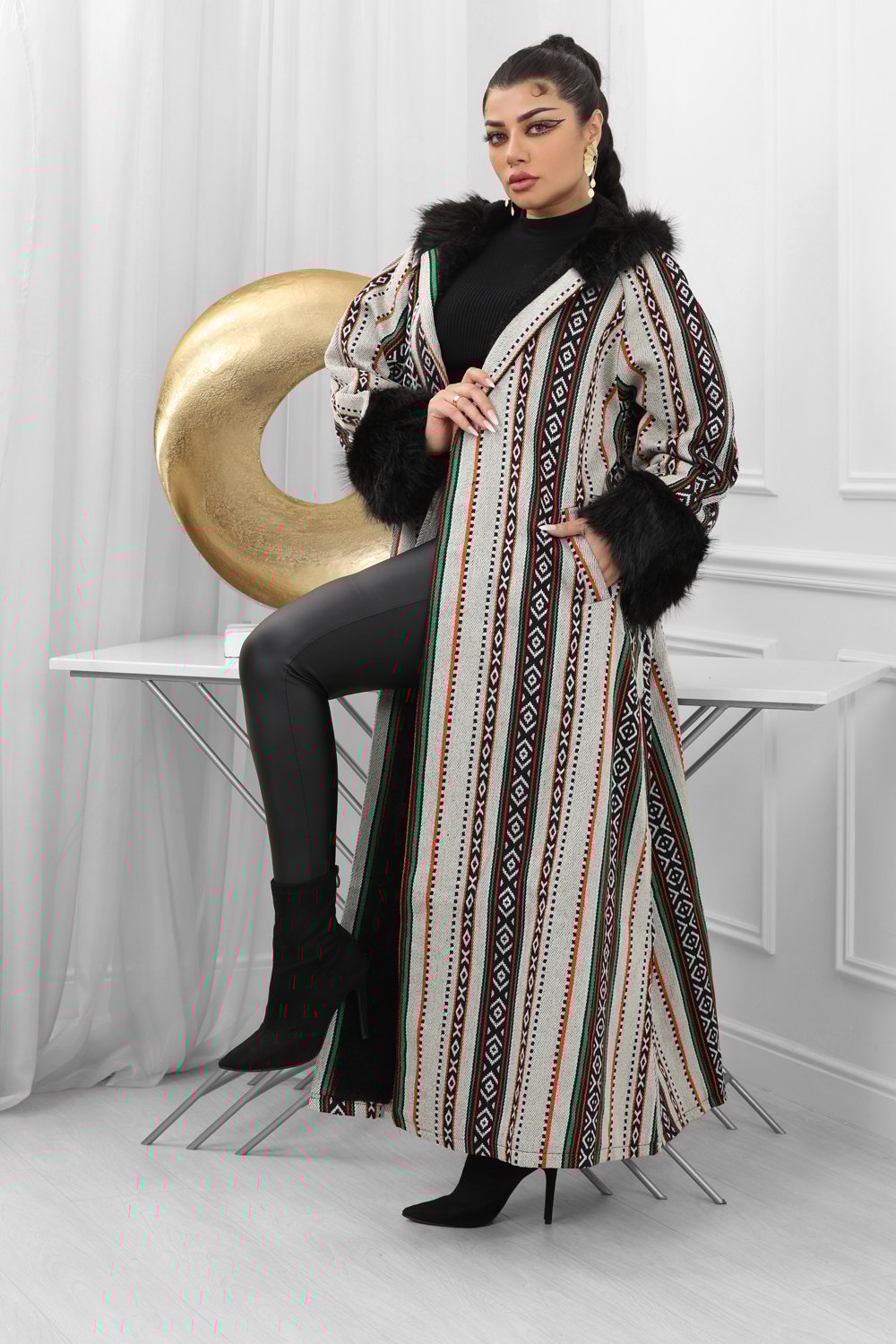 بشت شتوي أنيق بطول ماكسي، وتصميم تراثي بنقوش تقليدية ملونة، مصنوع من خامة دافئة، ومزود بغطاء رأس مبطن فرو، كذلك أضفنا الفرو لنهاية الأكمام، لنعكس التراث بتصميم عصري.