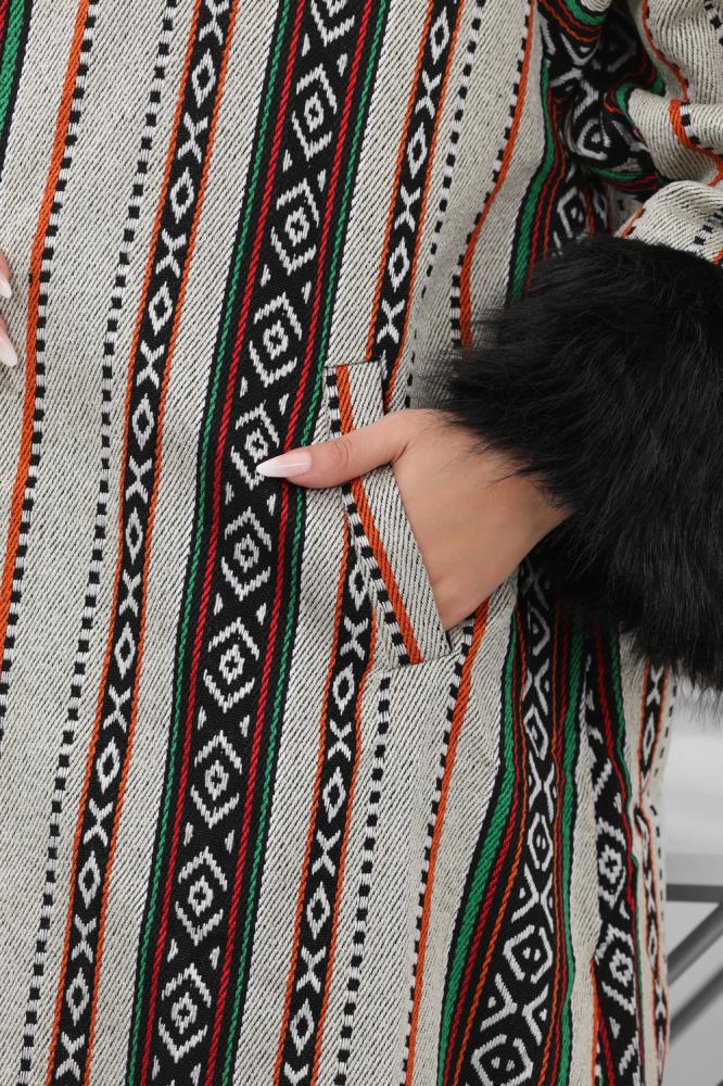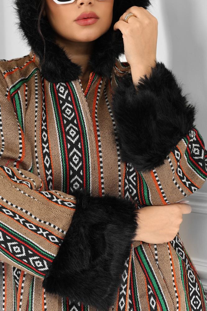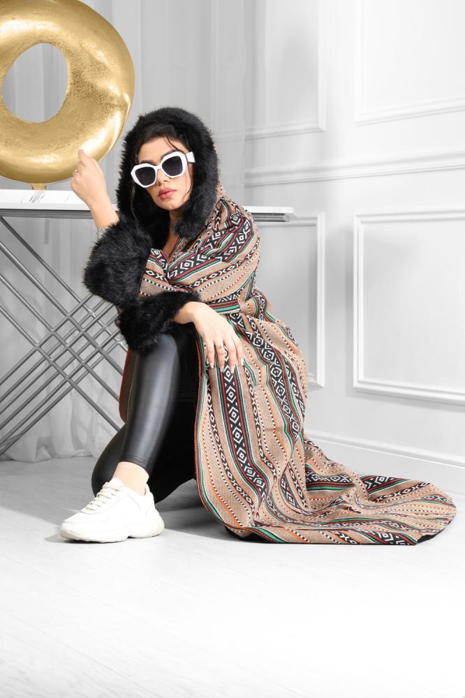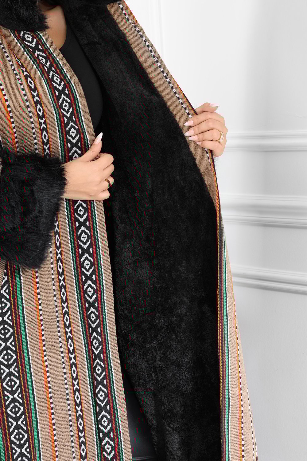 بشت شتوي أنيق بطول ماكسي، وتصميم تراثي بنقوش تقليدية ملونة، مصنوع من خامة دافئة، ومزود بغطاء رأس مبطن فرو، كذلك أضفنا الفرو لنهاية الأكمام، لنعكس التراث بتصميم عصري.