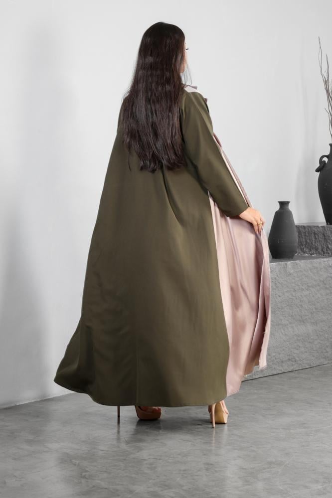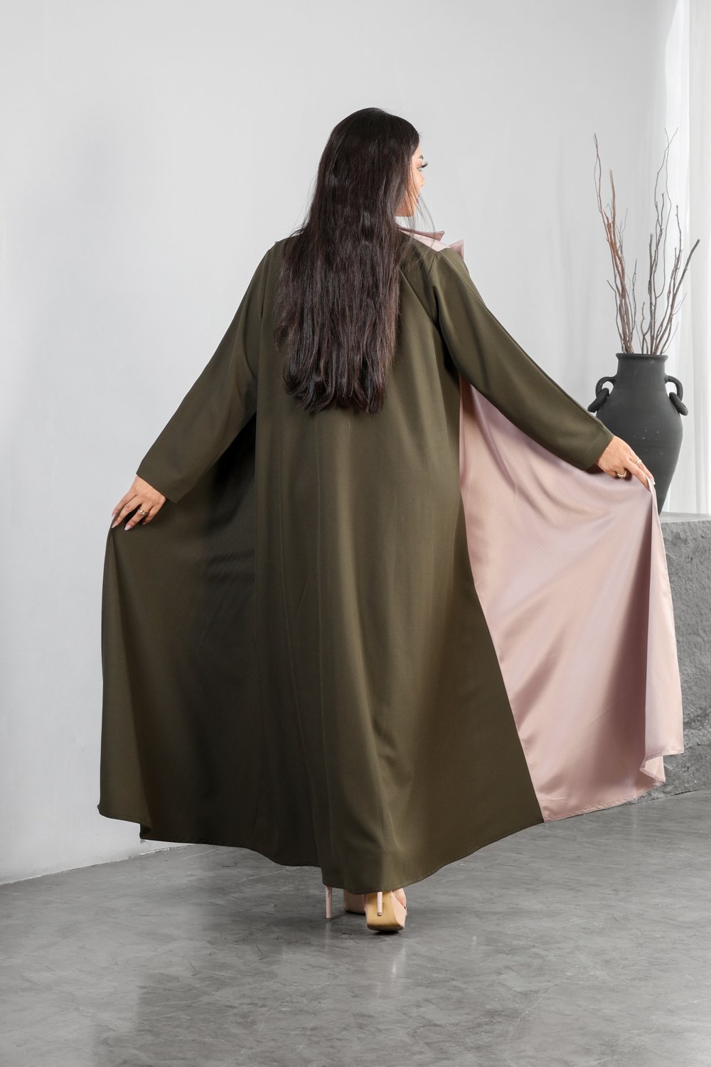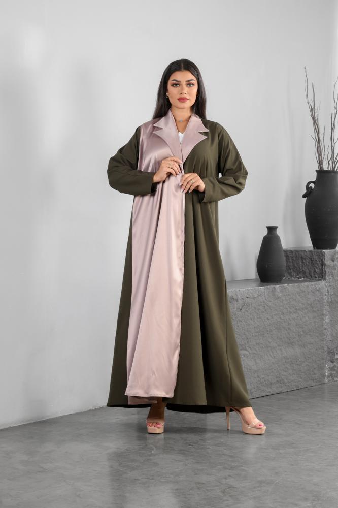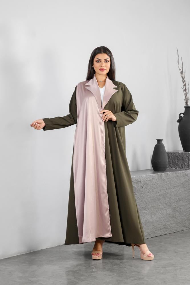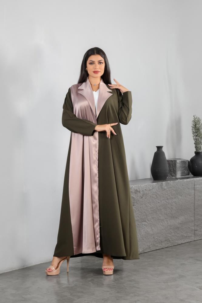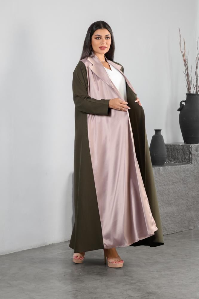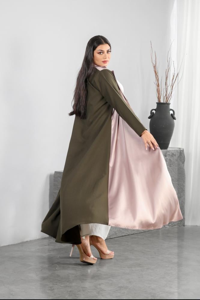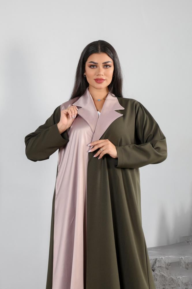 أشعري بالانطلاق والراحة، بتصميم "مايل" لعباية عصرية مزيج من اللون الزيتي، والوردي الفاتح ، من أفضل أنواع الأقمشة، بياقة عريضة تمنح التصميم مظهراً فريداً.