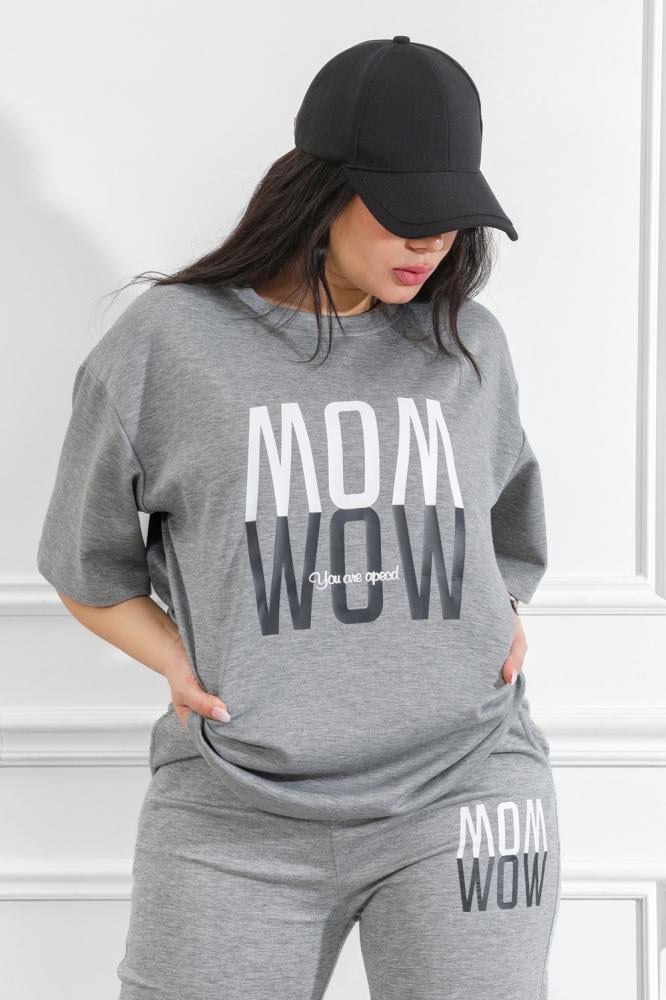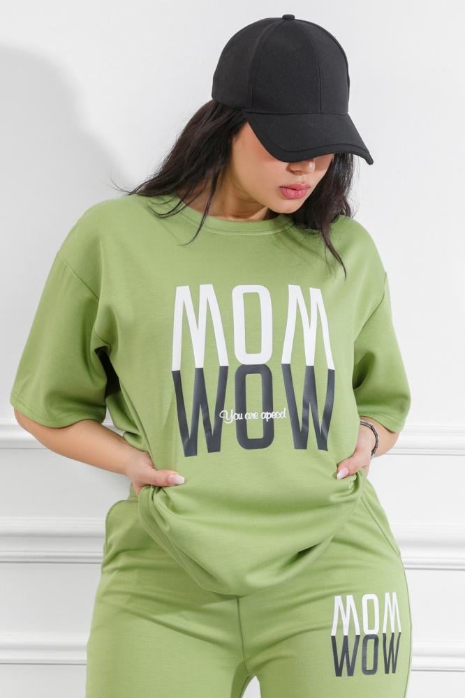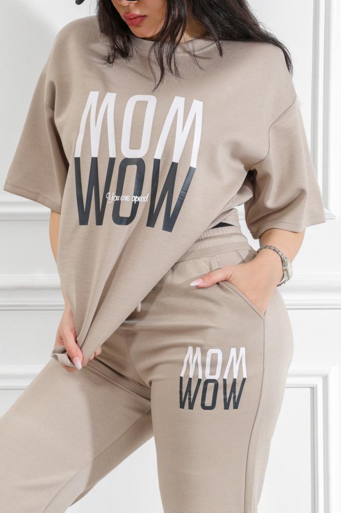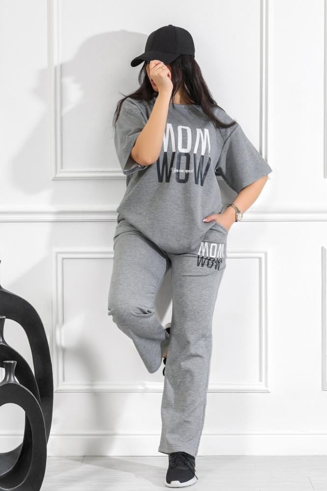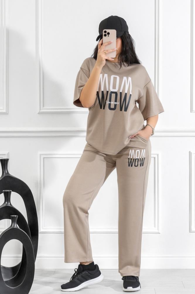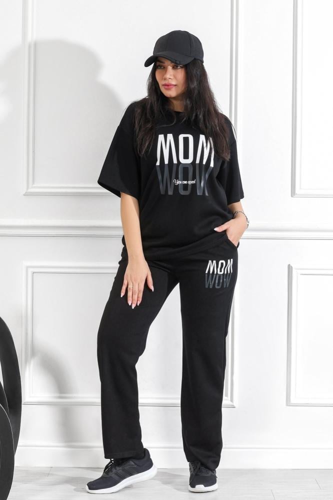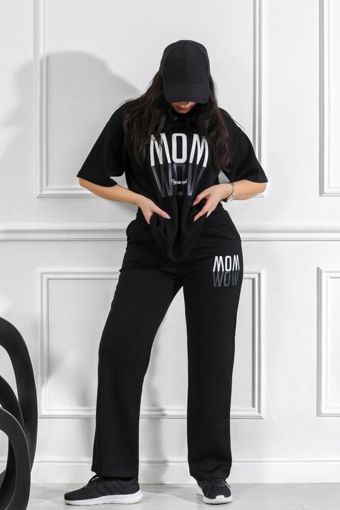 - تيشيرت وسروال مطبوع عليهما كلمتا "MOM" و"WOW" باللون الأسود على خلفية وردية ناعمة، مما يُعطي هويةً فريدةً ورسالةً مرحة.