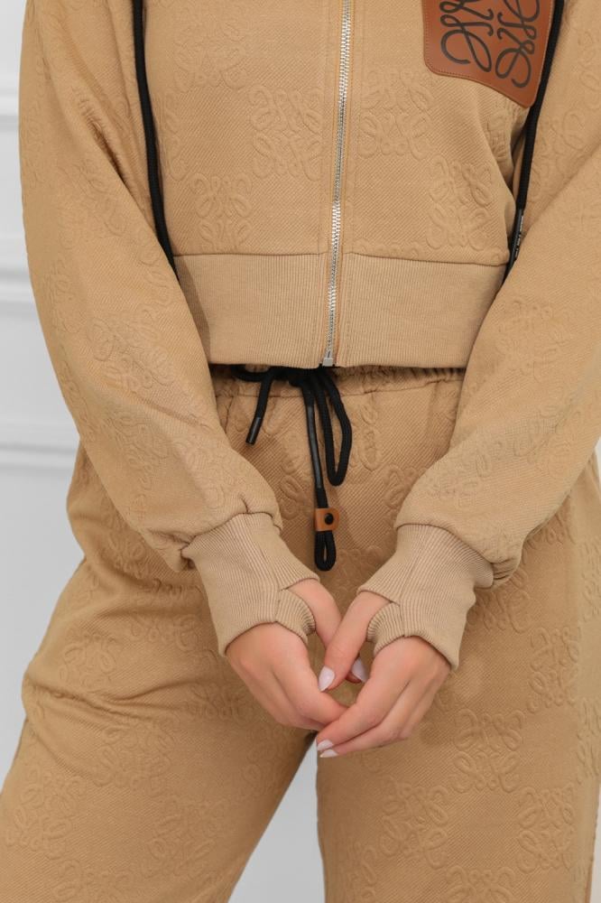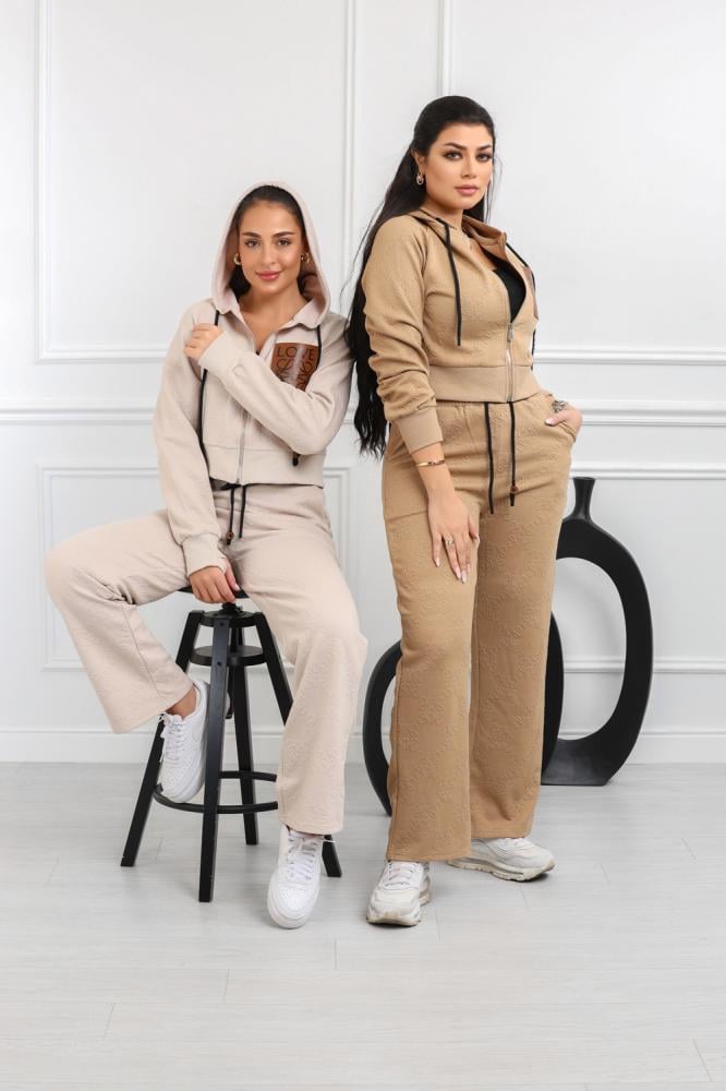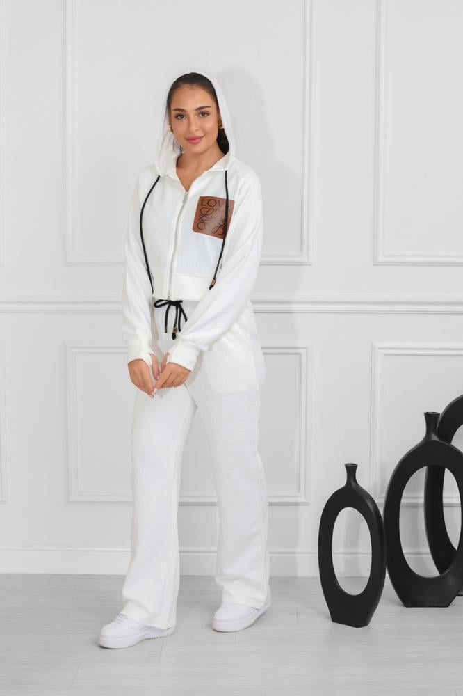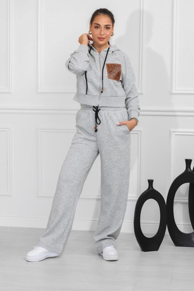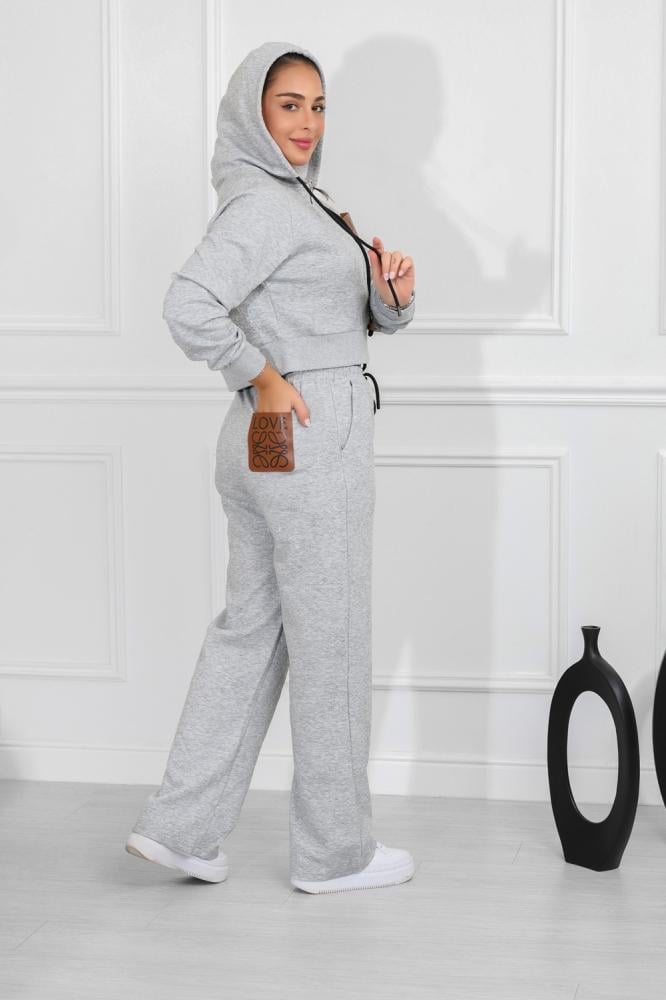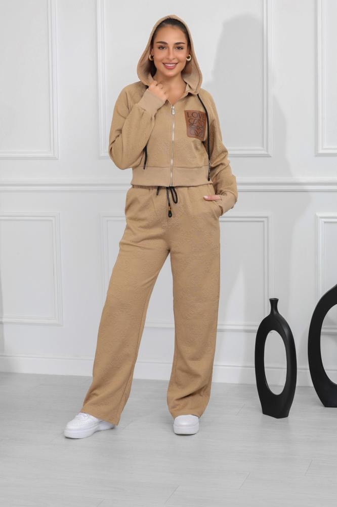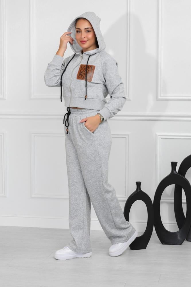 طقم نسائي، بتصميم كاجوال ومظهر رياضي، مُكون من قطعتين، سويت شيرت قصير بأكمام طويلة وقبعة قابلة للتعديل برباط، مزود بلوجو بجانب الصدر، مع بنطال واسع بقصة مستقيمة من خامة مريحة فضفاضة.