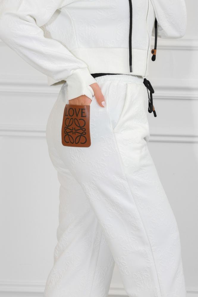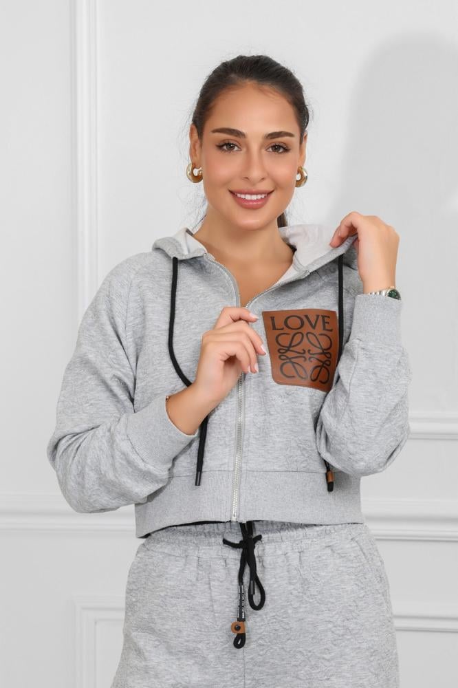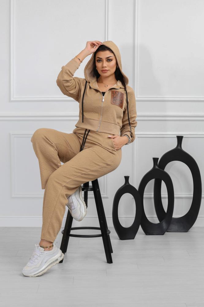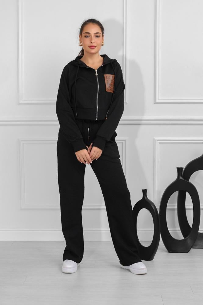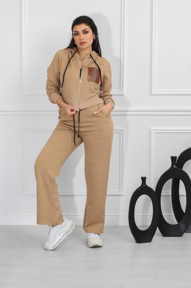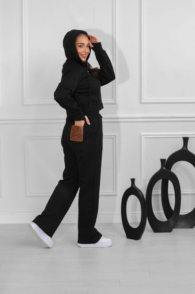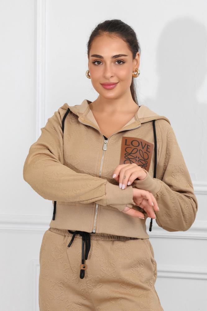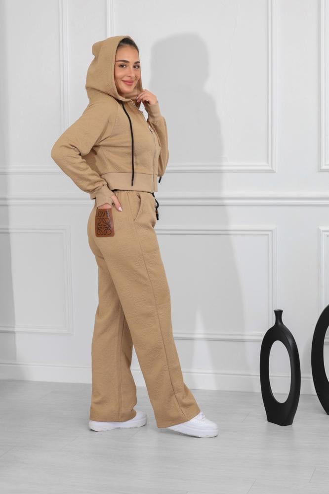 طقم نسائي، بتصميم كاجوال ومظهر رياضي، مُكون من قطعتين، سويت شيرت قصير بأكمام طويلة وقبعة قابلة للتعديل برباط، مزود بلوجو بجانب الصدر، مع بنطال واسع بقصة مستقيمة من خامة مريحة فضفاضة.