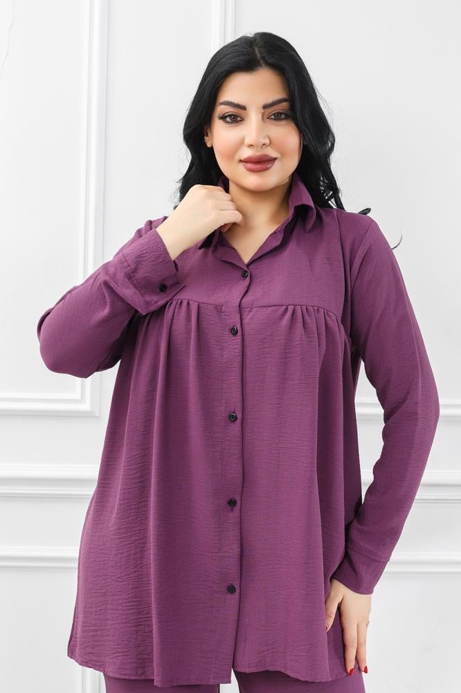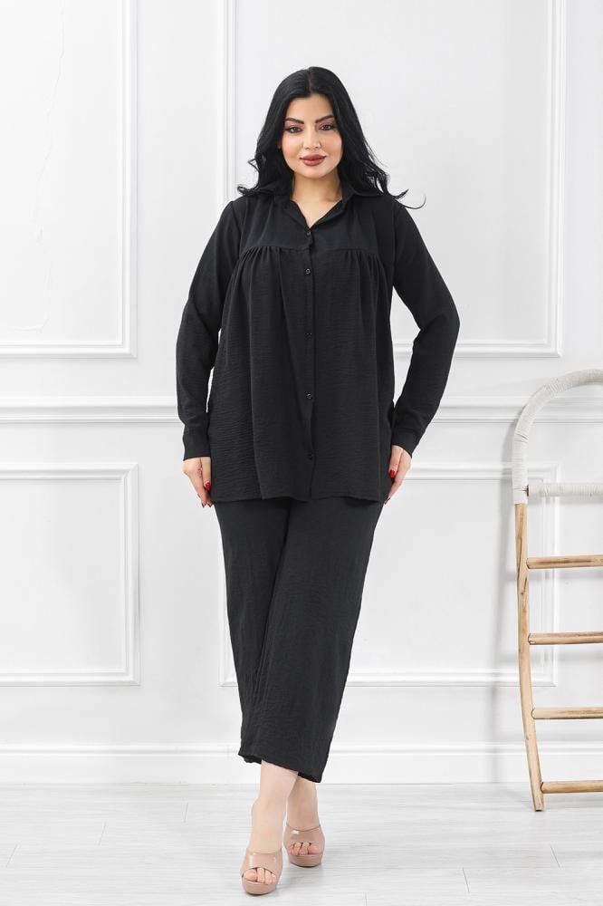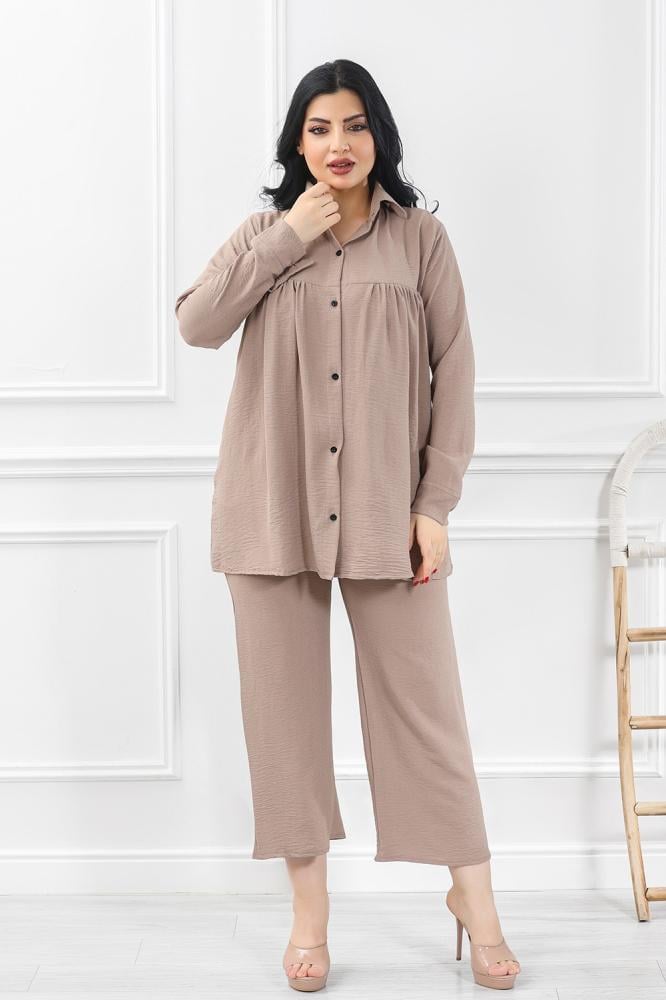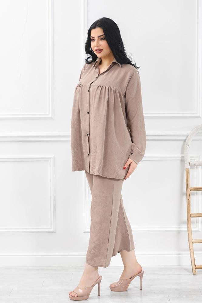 - سترة كاجوال بقطع مُريح وأزرار أمامية، مع بنطلون واسع الساقين من نفس اللون، مما يُشكل تناسقًا لونيًا يُعزز الإحساس بالتماسك والأناقة.