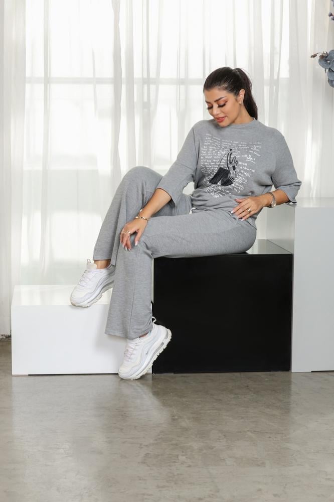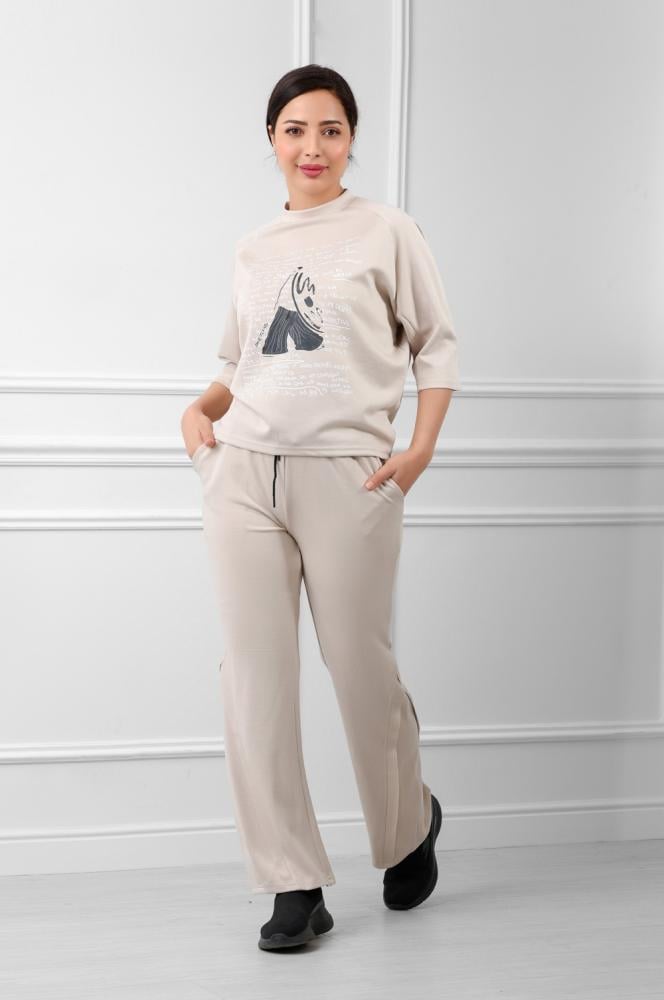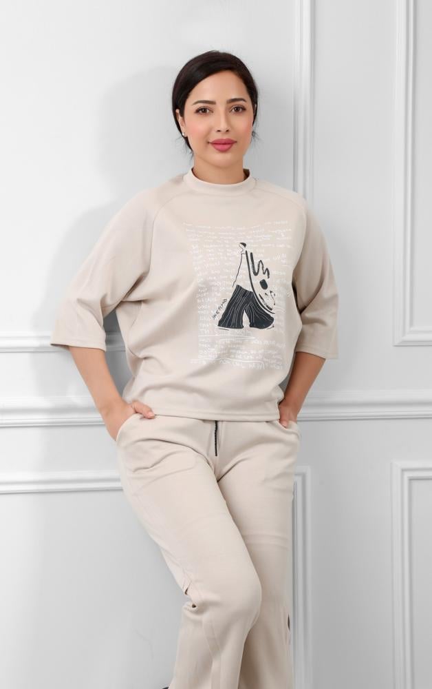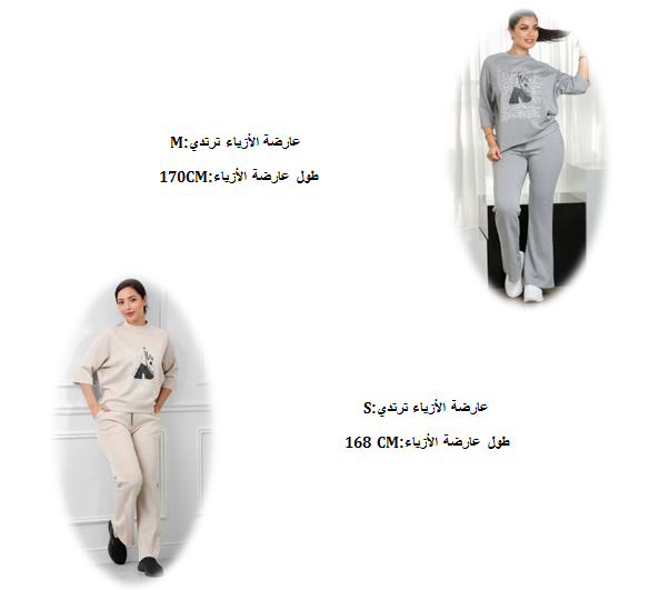 القطع المتناسق: تصميم البنطلون الواسع والسويتر الفضفاض يخلقان توازنًا بين الموضة الرياضية والراحة اليومية، مع إبراز لخط الكتف الطبيعي لتعزيز الإحساس بالاسترخاء.