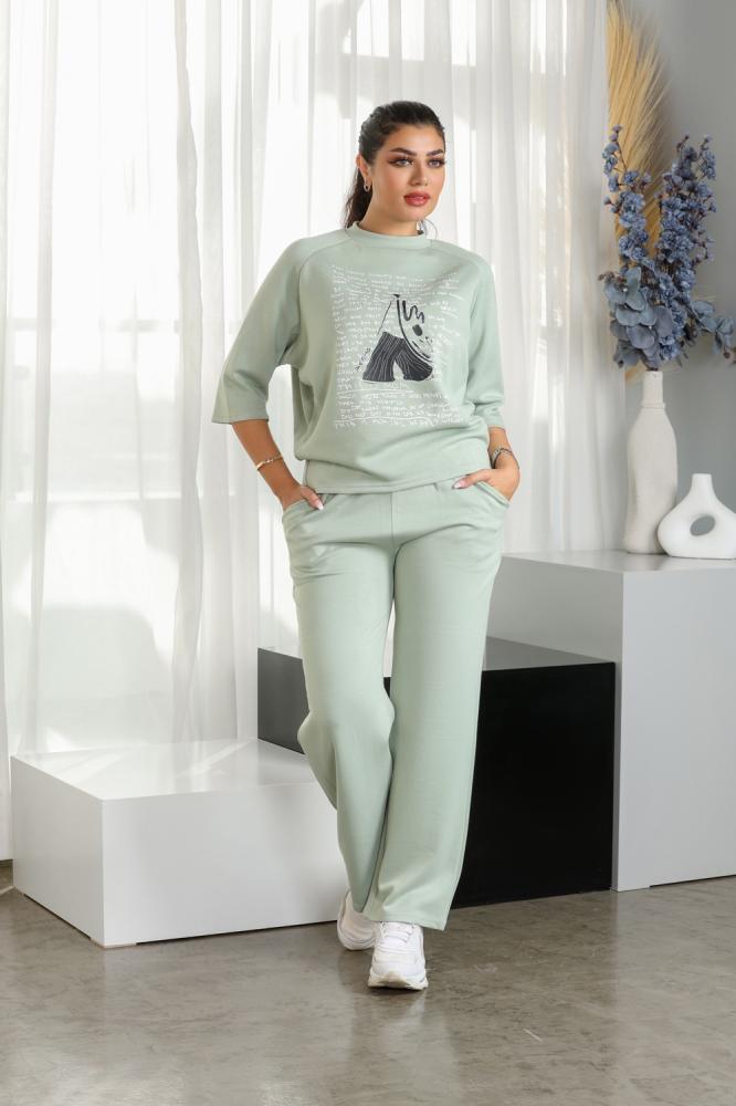 التناغم اللوني: يعطي إحساسًا بالانتعاش والهدوء، بينما التصميم الرسومي على الصدر يضفي جرأةً بصرية دون خروج عن النمط الهادئ.