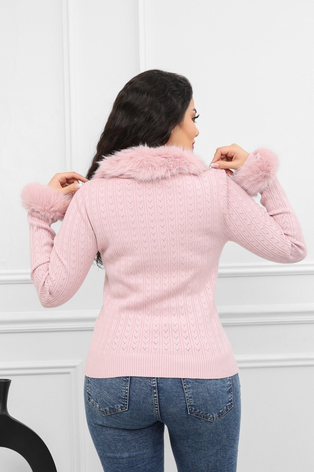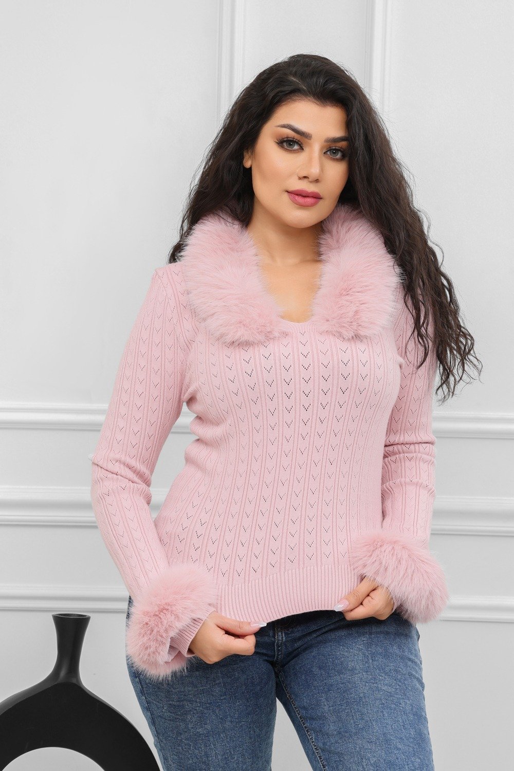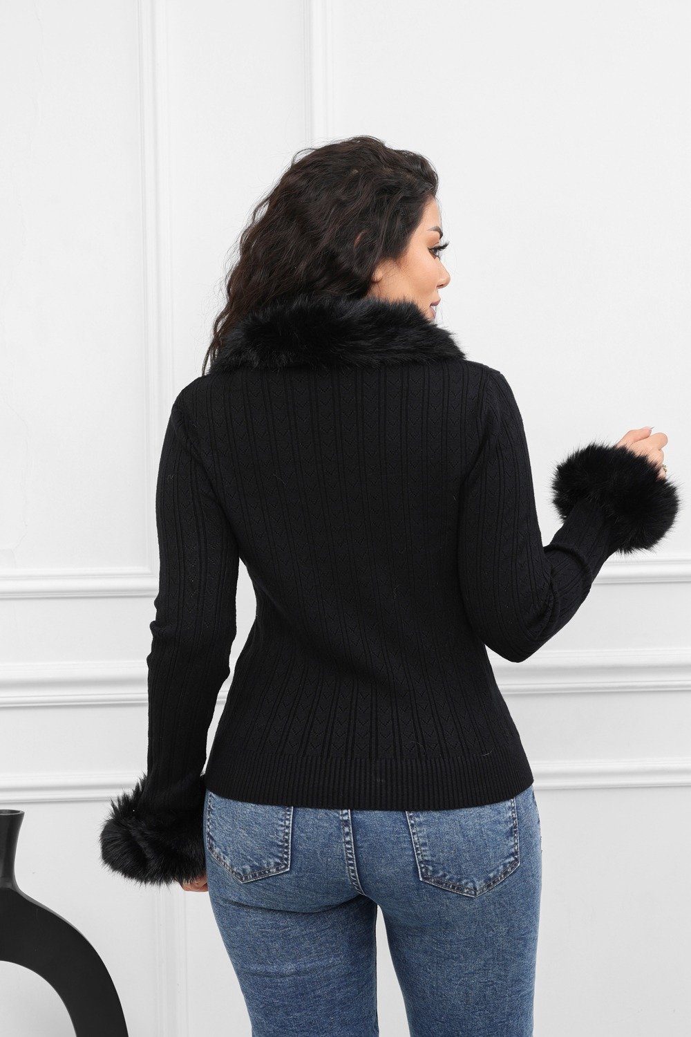 كنزة نسائية صوف شتوية بأكمام طويلة، مزينة بفرو صناعي على الياقة والأساور – قطعة فاخرة تجمع بين الدفء والرقي