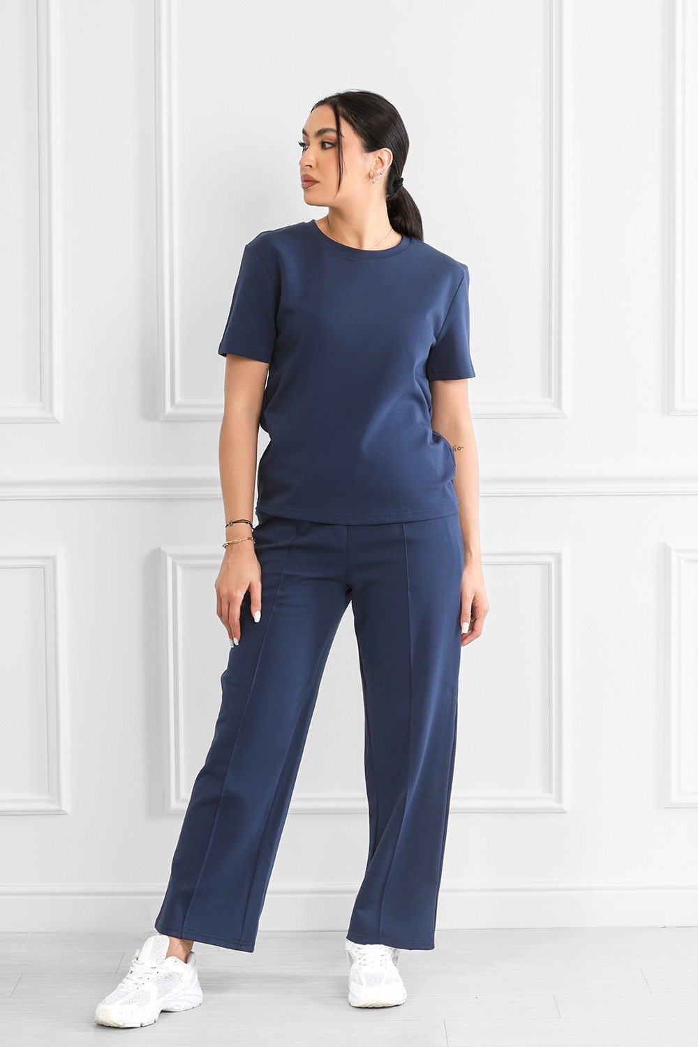 طقم متكامل يضم توب قصيرة الأكمام وبنطال أرجل واسعة.