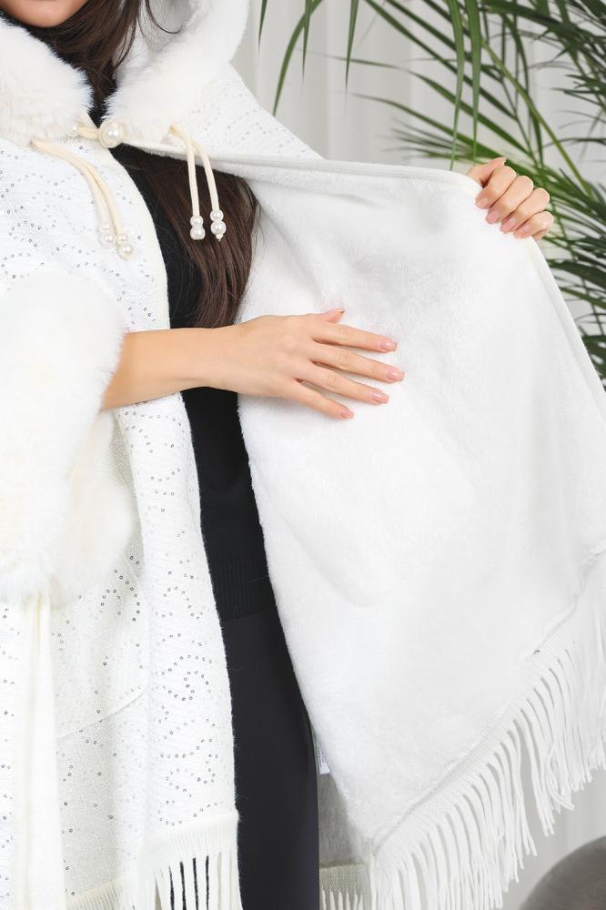 كاب نسائي (Cape) أنيق، مزوّد بغطاء رأس (هود) وفرو صناعي وشرّاشيب أسفل القطعة، يقدّم إطلالة عصرية وفخمة في آن واحد.