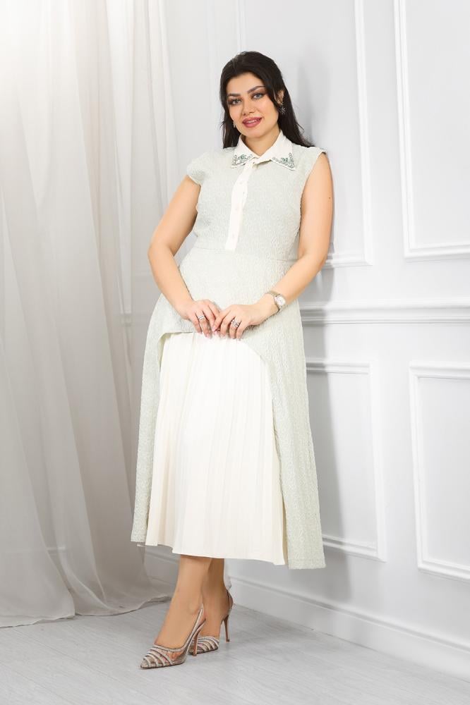 - تكوين لوني متناغم: تيفاني خافت (للجزء العلوي) + أبيض نقي (للتنورة) وياقة بلون أبيض مطرّزة تربط بين القطعتين بأناقة