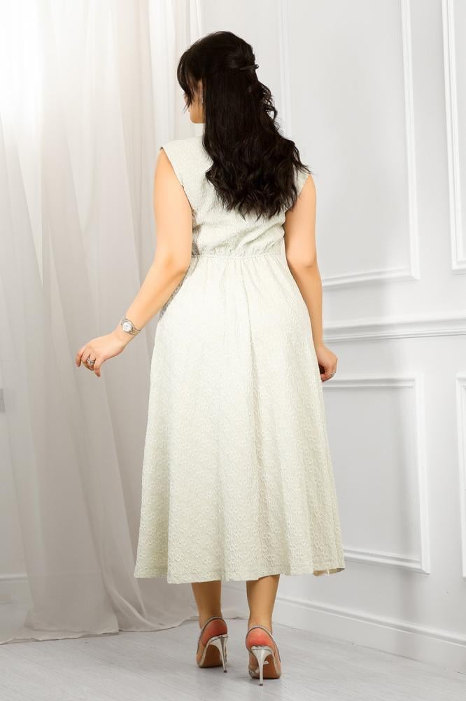 - فستان سهره نسائي بقطعة علوية كورسيه بدون أكمام بتصميم محكم والقطعة سفلية على شكل تنورة بيضاء متدفقة بطيات ناعمة