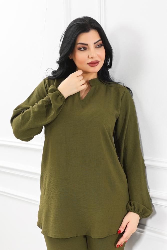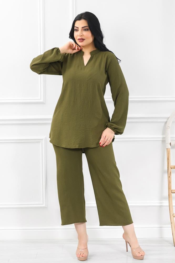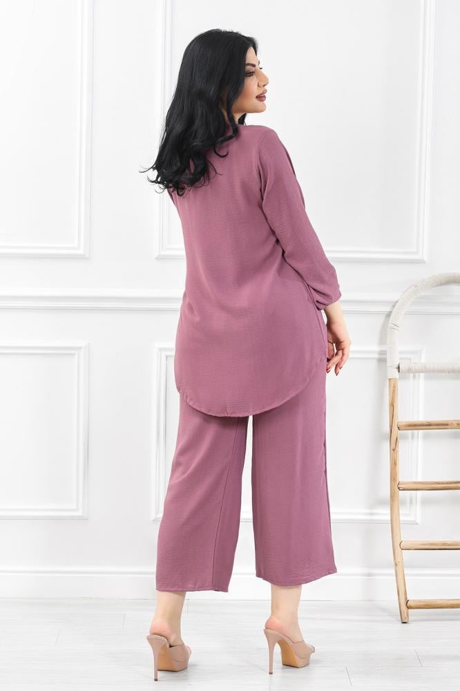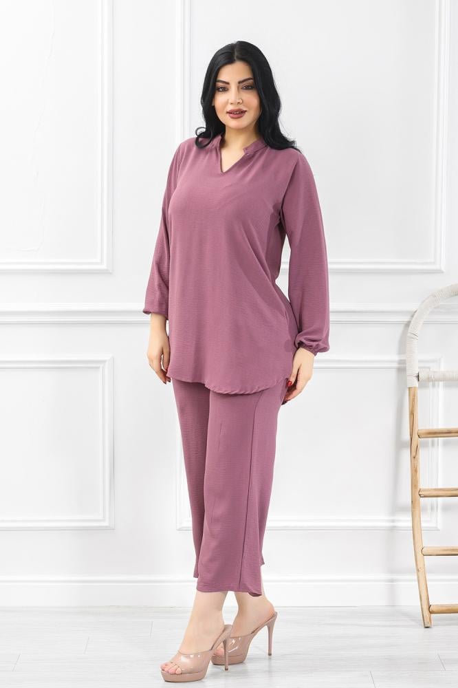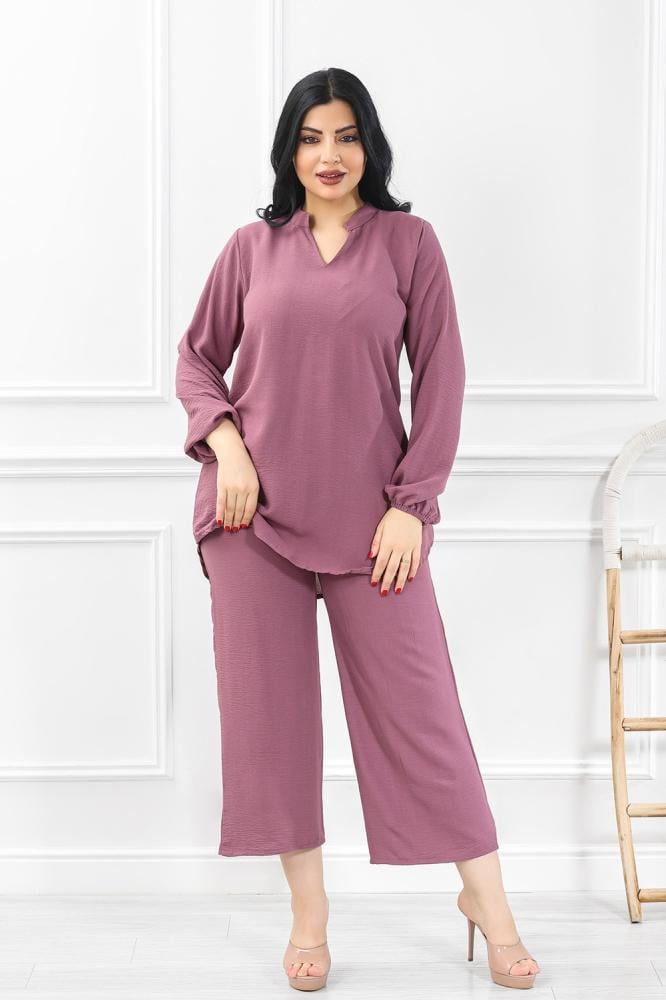 - تتميز هذه الإطلالة بتصميم عصري يُبرز التوازن بين الراحة والأناقة، حيث تتألف من توب فضفاض بأكمام طويلة وبنطلون واسع الساقين من نفس اللون الموف الناعم.