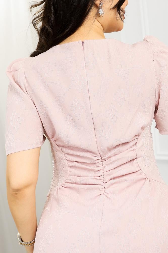- تصميم كامل الطول (Full-length) بكمين منفوخ قصير ورقبة مربعة مناسب للمناسبات الرسمية.