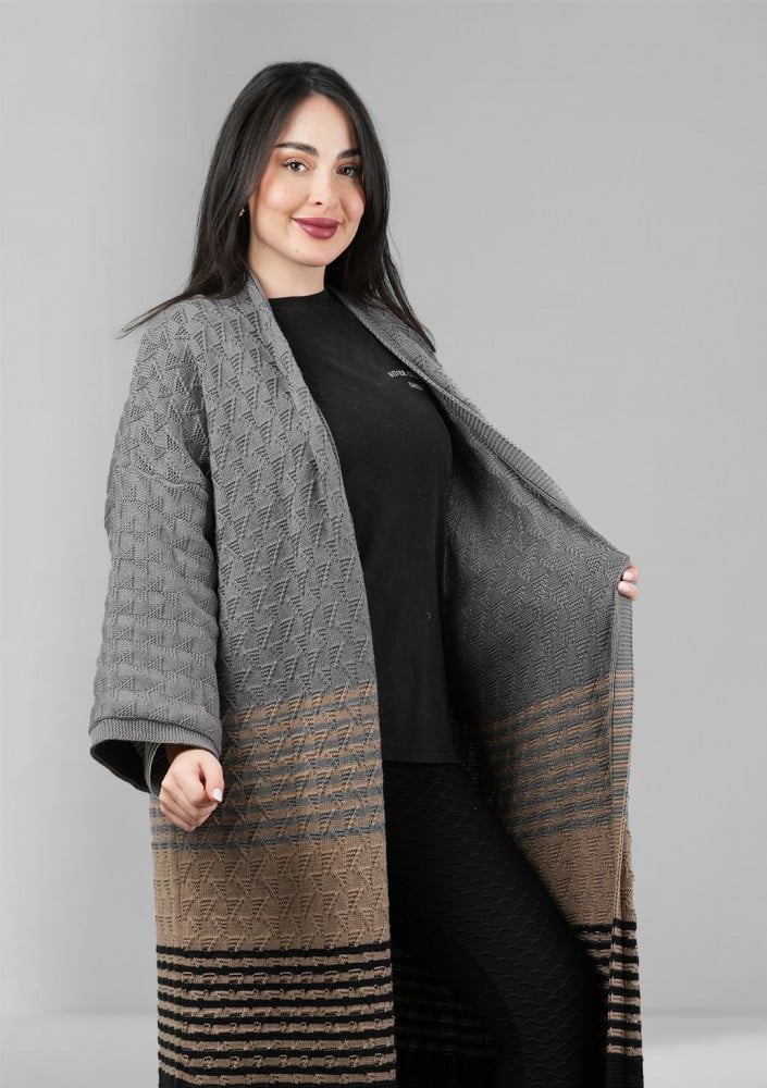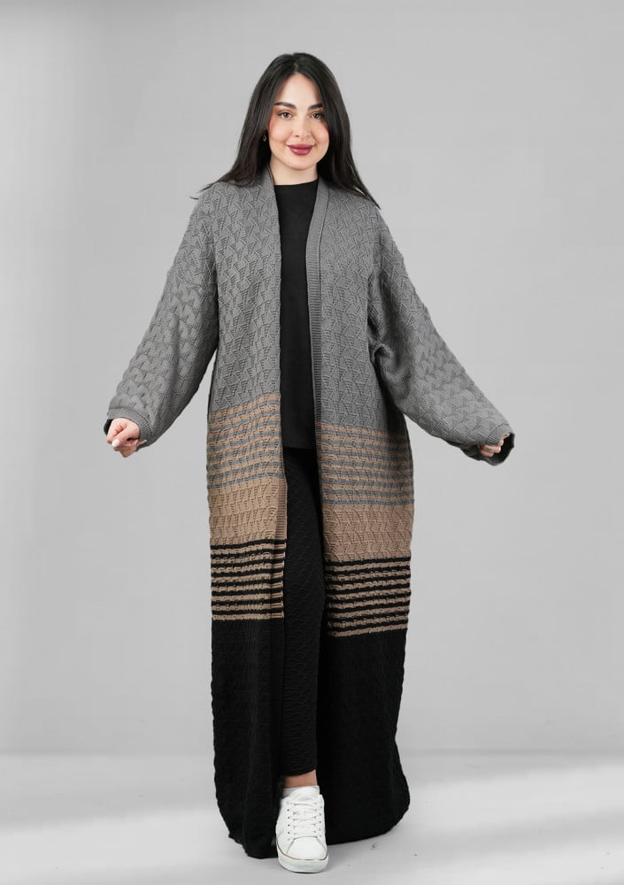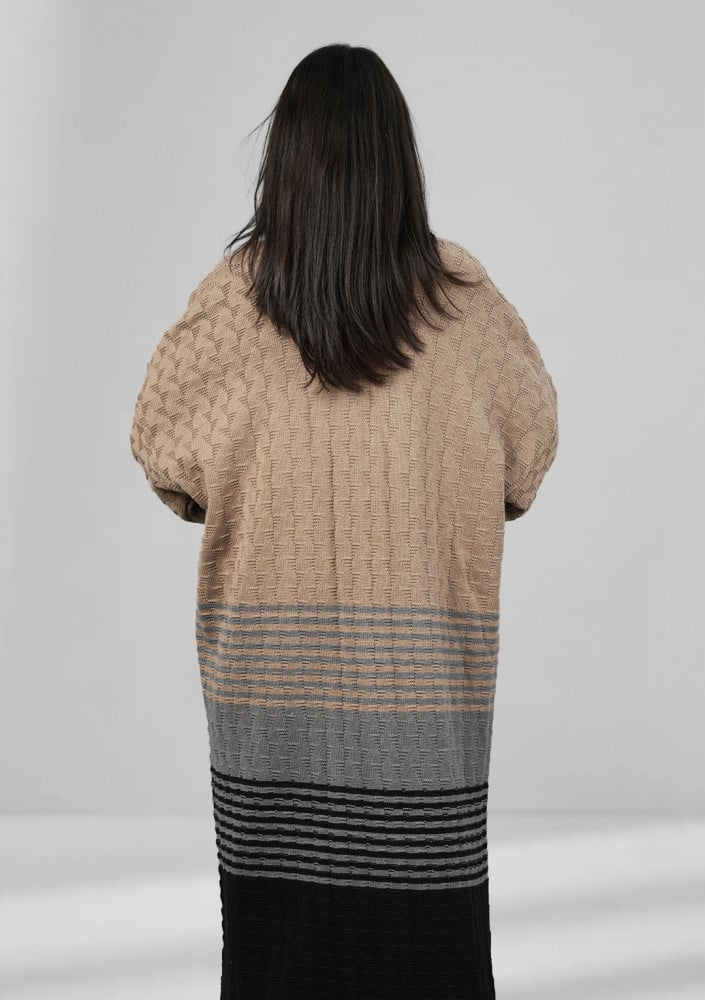 جاكيت محبوك طويل بتقسيم لوني أفقي ثلاثي