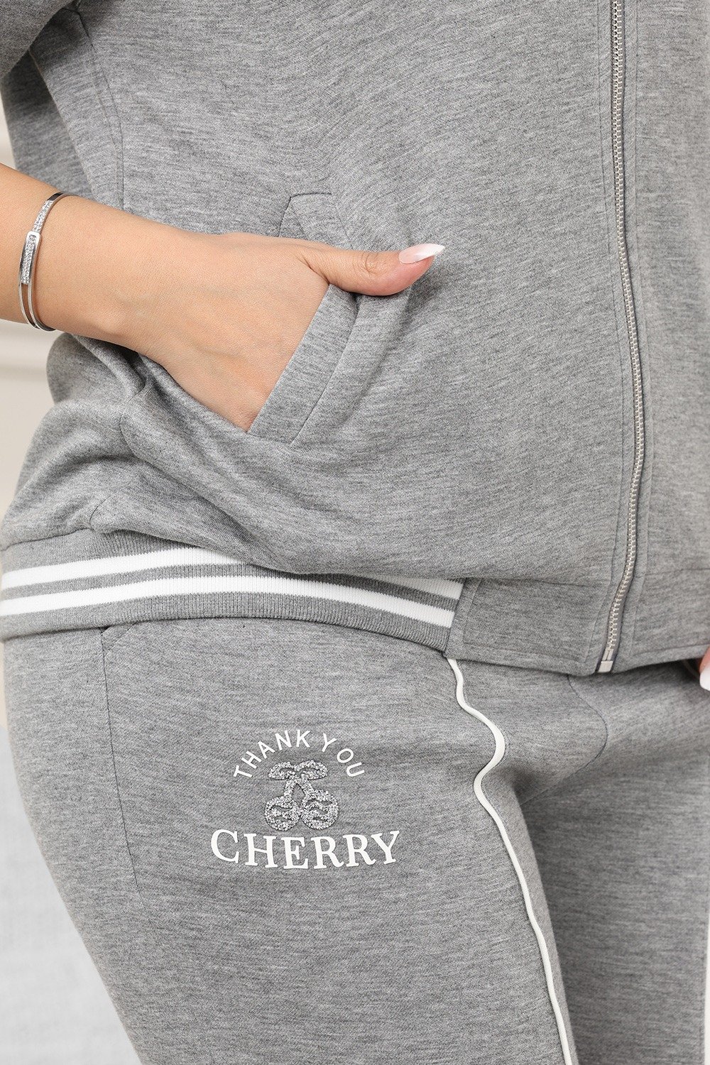 Women’s casual tracksuit with a sporty design, consisting of two pieces: a sweatshirt with a front zipper and a small logo on the side of the chest, with lines decorating the design in a different color, in addition to pants made of loose material, with cuffs around the ankle with lines decorating the design.