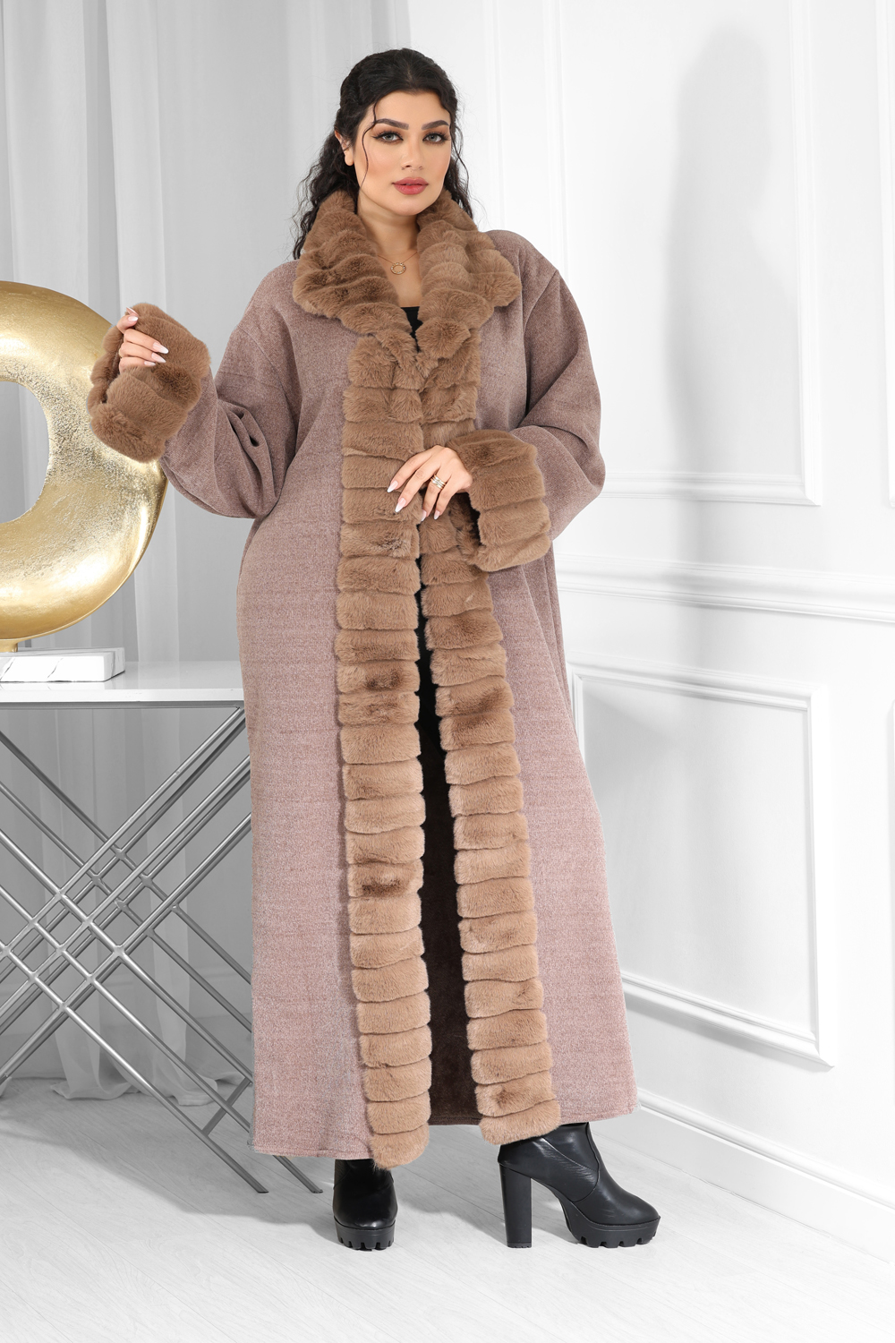 A modern and elegant design for a maxi winter bisht, made of high-quality materials, decorated with fur on the edges of the design and the end of the sleeves, and equipped with an elegant collar lined with fur.