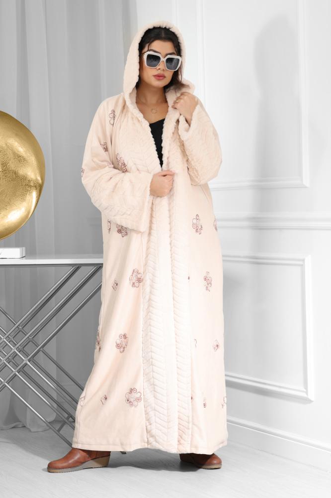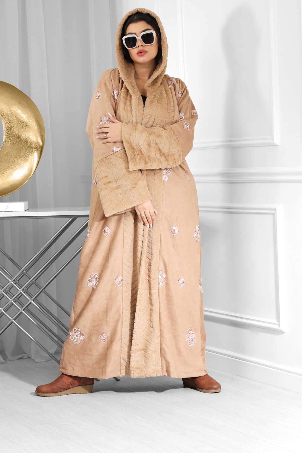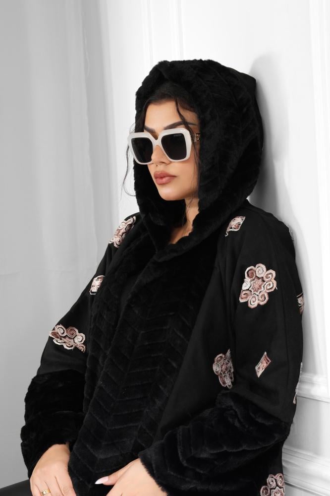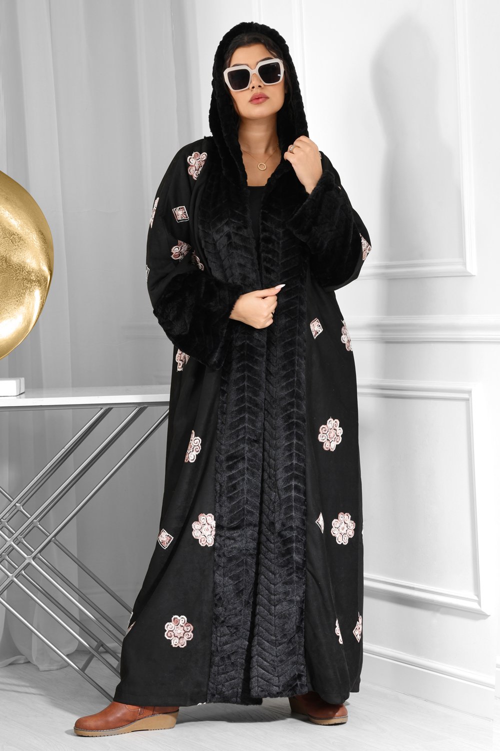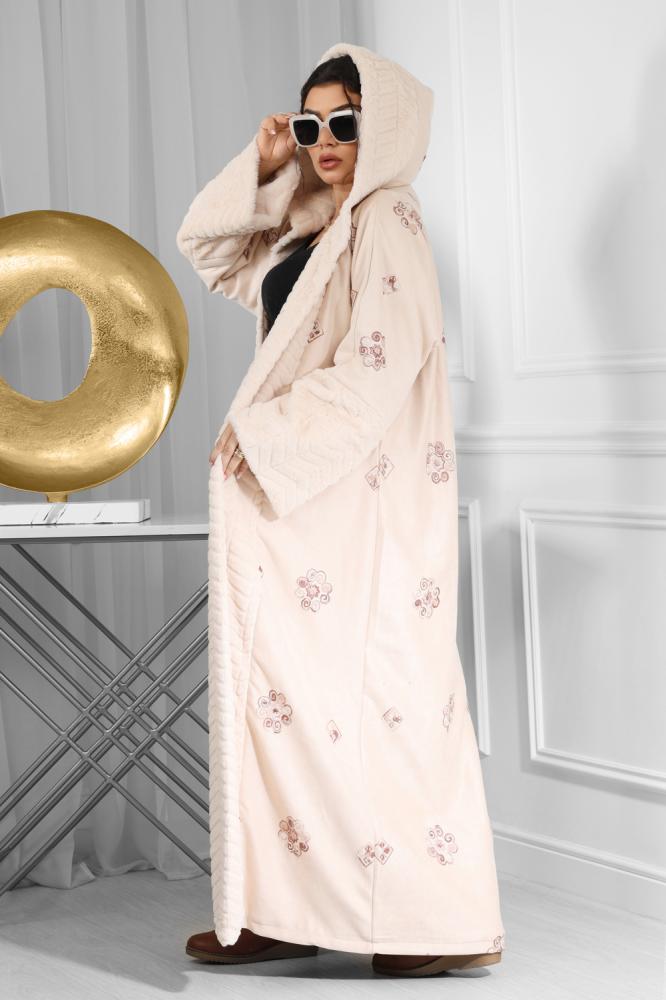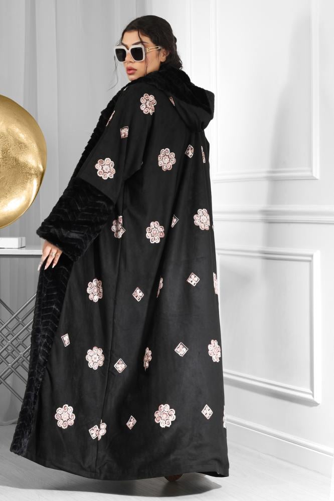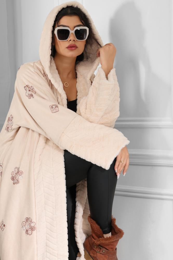 Elegant maxi-length winter bisht, made of high-quality materials, with a modern design featuring a colorful floral pattern, with attractive patterned fur on the edges of the design and the end of the sleeves, with a fur hat and a small hook for an elegant closure.