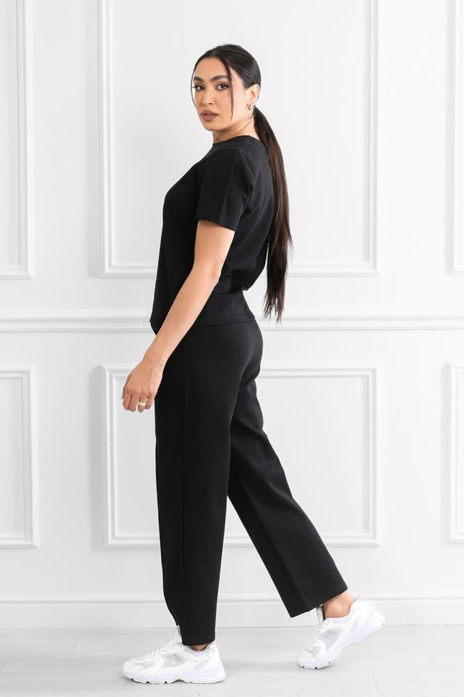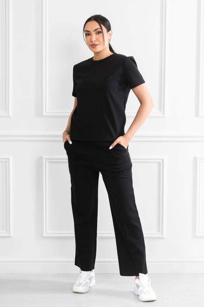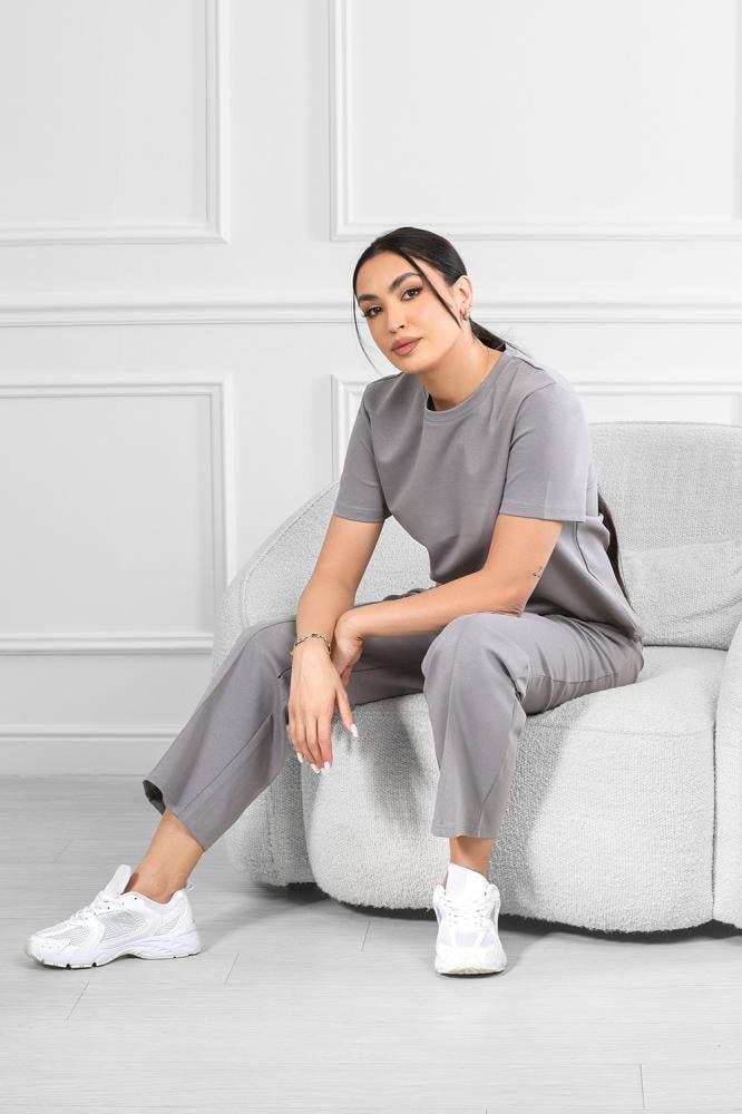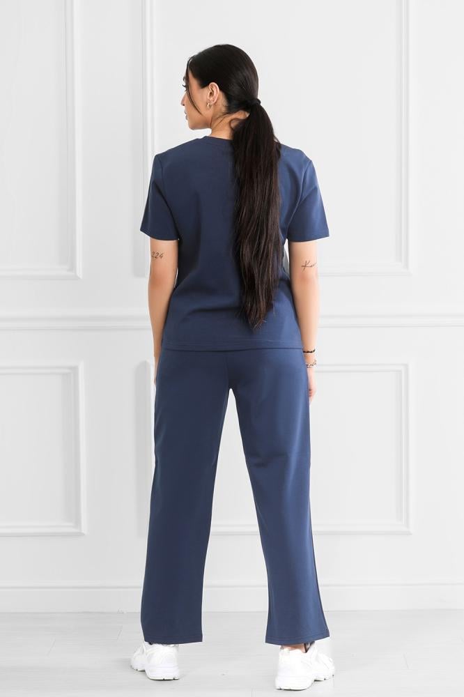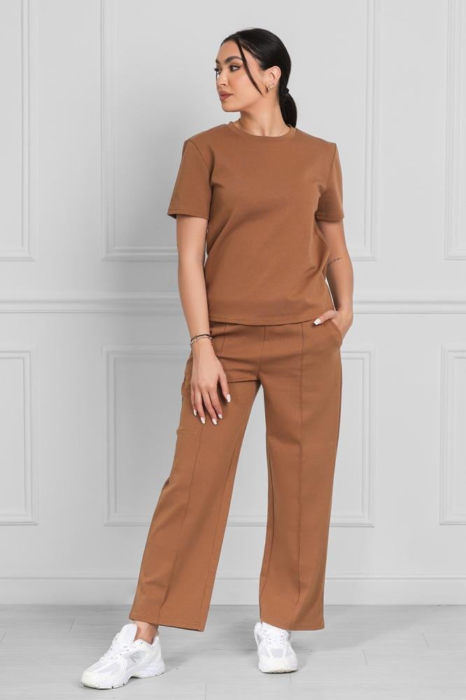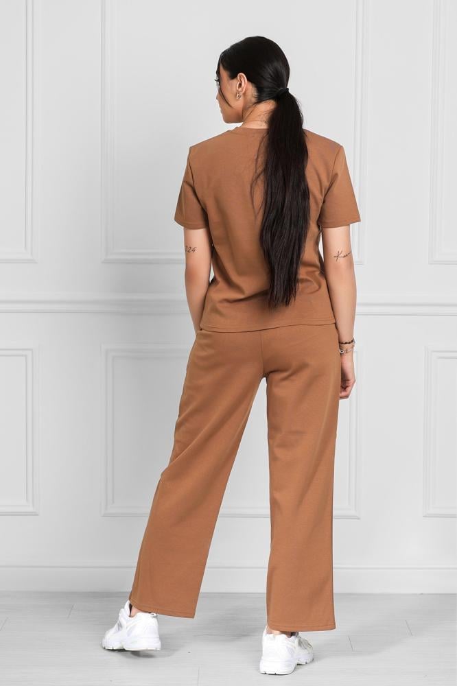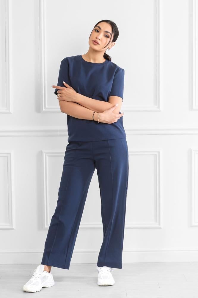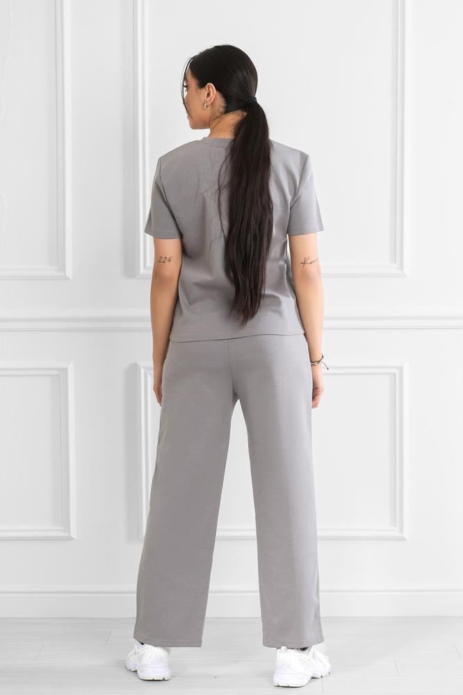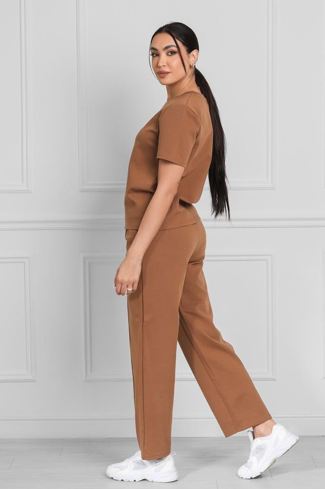 Complete set includes a short-sleeved top and wide-leg pants.